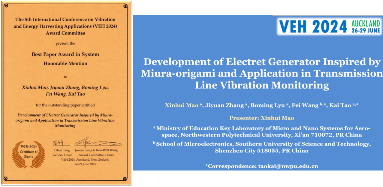 永利官网微系统工程系博士生毛新辉、硕士生张继元参加了此次大会。发表了题为“Development of Electret Generator Inspired by Miura-origami and Application in Transmission Line Vibration Monitoring”的口头报告,获得了参会人员的广泛好评,并获“VEH2024最佳论文奖”。