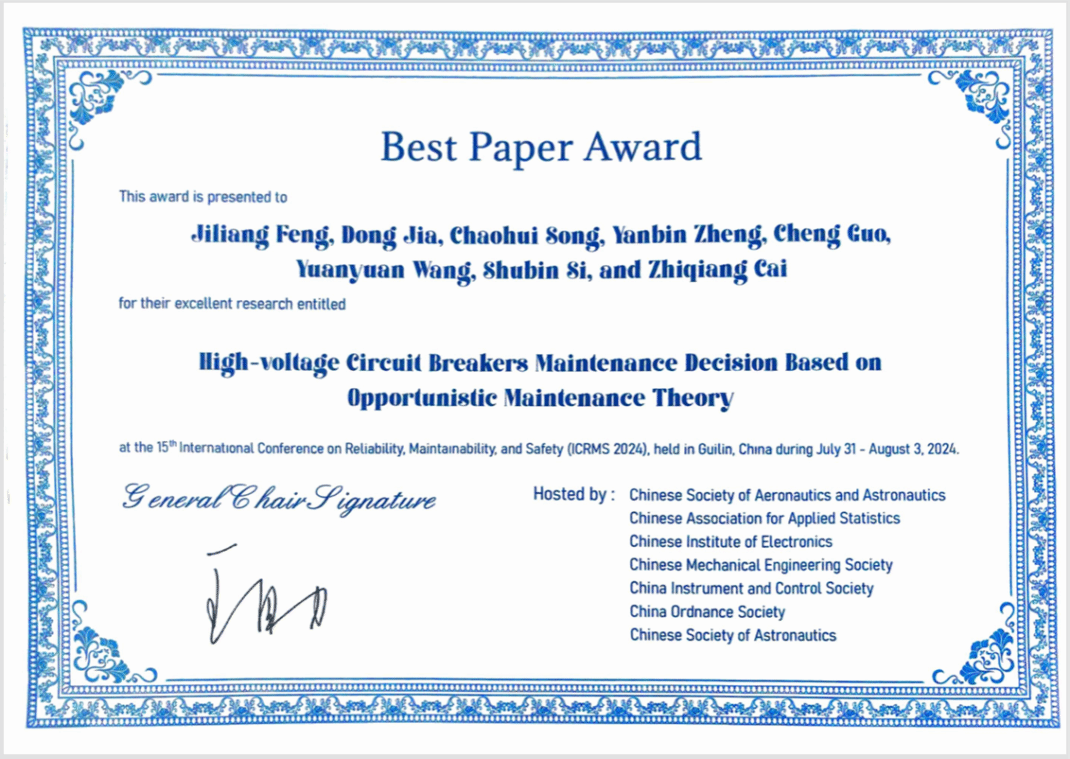 永利集团88304官网蔡志强教授课题组硕士生贾栋的论文《High-voltage Circuit Breakers Maintenance Decision Based on Opportunistic Maintenance Theory》荣获IEEE ICRMS国际会议“最佳论文奖”。