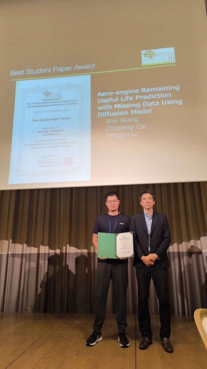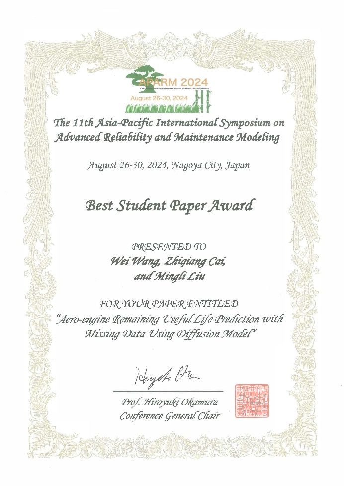 在此次会议上,永利集团88304官网蔡志强教授课题组荣获了APARM 2024最佳学生论文奖。获奖论文题为《Aero-engine Remaining Useful Life Prediction with Missing Data Using Diffusion Model》。该论文聚焦于航空发动机状态监测数据缺失对深度学习模型预测精度的影响,提出了一种名为DiffFMD的创新数据填充方法。通过有效填补数据缺失,这一方法显著提升了剩余使用寿命预测的准确性,展现了该课题组在复杂系统可靠性研究方面的重要进展。