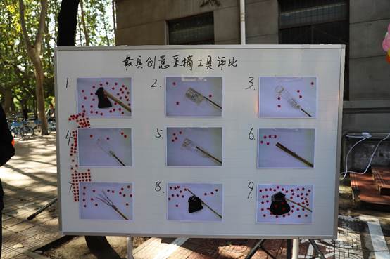 随着摘柿子活动的进行,创意采摘工具的评选也同时开始。赛前,永利官网学子们化身手工艺大师,从设计图纸到手工制造,用聪明才智创造各种神器,采用废旧材料、“十八道”工序精心制作了环保的采摘工具。