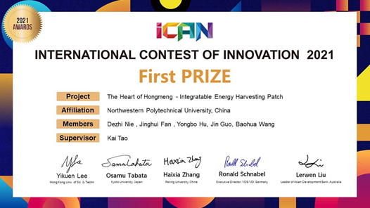 2021年度iCAN国际创新创业大赛国际总决赛(The International Contest of Innovation 2021)于12月19日圆满落幕,永利官网永利集团88304官网本科生团队作品“鸿蒙之心——可集成式自然能量采集贴”(The Heart of Hongmeng - Integratable Energy Harvesting Patch)荣获国际总决赛第一名,这是本届比赛中国代表队唯一获得一等奖的作品,也是西工大参加该比赛十几年以来取得的最好成绩之一。