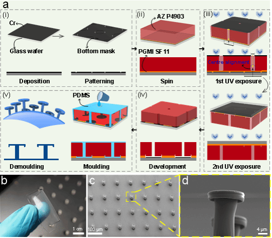 为获得具有垂直悬垂的柔性双凹型微阵列超斥表面,永利集团88304官网马炳和教授课题组通过光刻曝光精细设计,结合MEMS双层光刻剥离工艺,首次在双层光刻胶中获得了双凹型微结构空腔(图4),利用一步微复制工艺(图5)得到了PDMS(聚二甲基硅氧烷)基仿生柔性双凹型微阵列表面。本方案较目前已有的柔性双凹型微结构制备方法较大优势:双凹型微结构的垂直悬垂腔直接在光刻胶模具中一步浇筑获得,相应的聚合物基微结构具备高稳定性;基于光刻及光刻胶模具的加工方法可获得较大面积的柔性微结构表面,加工效率高,增强了实用性。