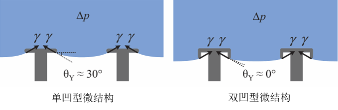 图2 单凹型和双凹型微结构抗润湿原理对比图 (Science 2014, 346, 6213)