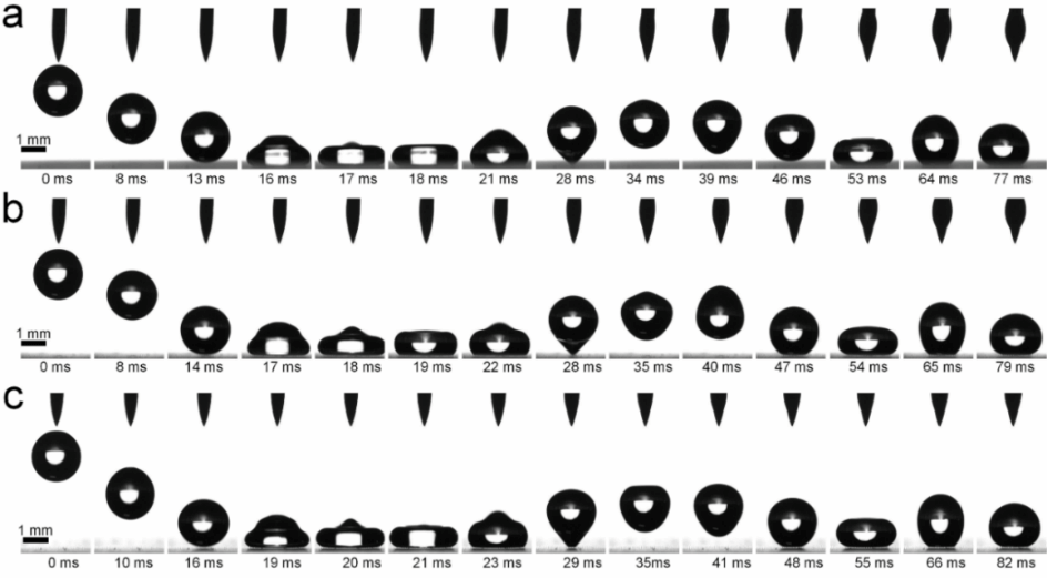 基于以上优势,获得的PDMS超斥表面(无需氟化处理)可可排斥极低表面能的液体(3M Fluorinert FC-70,18 mN m-1),乙醇的最大突破压力高达164.3 Pa, 并允许乙醇液滴以高达7.1的韦伯数在表面完全反弹(图6)。另外该超斥表面具有稳定的液体排斥能力,在表面改性或拉伸、弯曲等严苛测试条件下性能保持稳定。该制备方法为制备较大面积、结构稳定的超斥微结构阵列表面以及其他复杂三维微结构阵列提供了新思路。