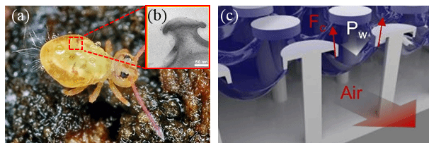 图1 (a)跳虫皮肤表面排斥液滴;(b)跳虫皮肤表面结构TEM图(PLoS One 2011, 6, 25105);(c)双凹微结构表面模型图