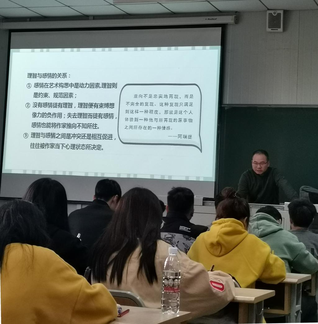 活动第一环节为文学概论课程课堂教学观摩。主讲教师谭诗民从“想象与联想、灵感与直觉、理智与情感”三方面生动讲授了“艺术构思中的心理机制”。