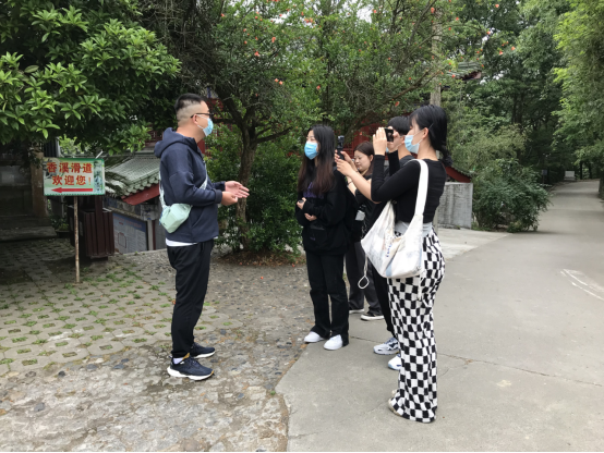 采风活动期间,8组学生在香溪洞风景区内有计划地在老师指导下进行创作。初入景区时,同学们还有一丝拘谨,面对竹木蔽山、花草遍地的自然风光,这丝拘谨很快被打破,大家相互配合,各自展开拍摄活动。有的用镜头捕捉自然倩影,有的在与景区工作人员交流中寻找新闻点,还有的拿出提前备好的道具圆一个古风剧场的梦……山涧鸟鸣、翠屏相列的风光不断激发同学们的创作灵感。采访声、讨论声、欢笑声回荡山间,为幽静的景区增添了些许活力;鲜红的院旗、彩色的衣服、各样的设备,为满目翠绿的景区增添了不少颜色;新闻、视频、短剧等创作,为静态景区提供了流动的名片。每日采风活动结束时,指导老师会召集各小组开会,总结当日拍摄情况和问题,并做出详细解答和指导。