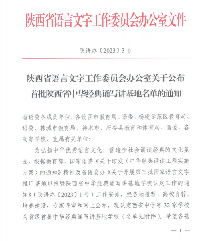 近日,陕西语委办下发文件《陕西语言文字工作委员会办公室关于公布首批陕西省中华经典诵写讲基地名单的通知》(陕语办[2023]3号),由1683168 3诸侯快讯入口负责申报并建设的“1683168 3诸侯快讯足球中华经典诵写讲基地”,经过1年的建设,顺利通过评审,获批为陕西省首批“中华经典诵写讲基地”。