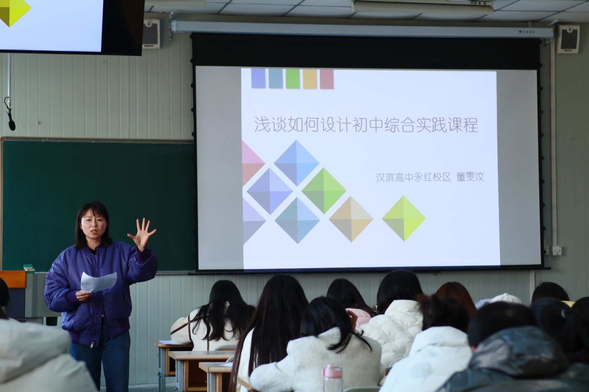 董老师首先结合新时代素质教育,谈了初中综合实践课程设计的意义,认为它对引导初中生正确处理生活关系,发展他们的科学精神与创意意识、信息意识与技术意识、劳动观念与动手能力等具有重要价值。然后,以“小值日,大学问”为切入点,分别从活动目标、活动准备以及活动过程三个方面,分析了当前初中综合实践课程设计存在的问题及其优化策略。