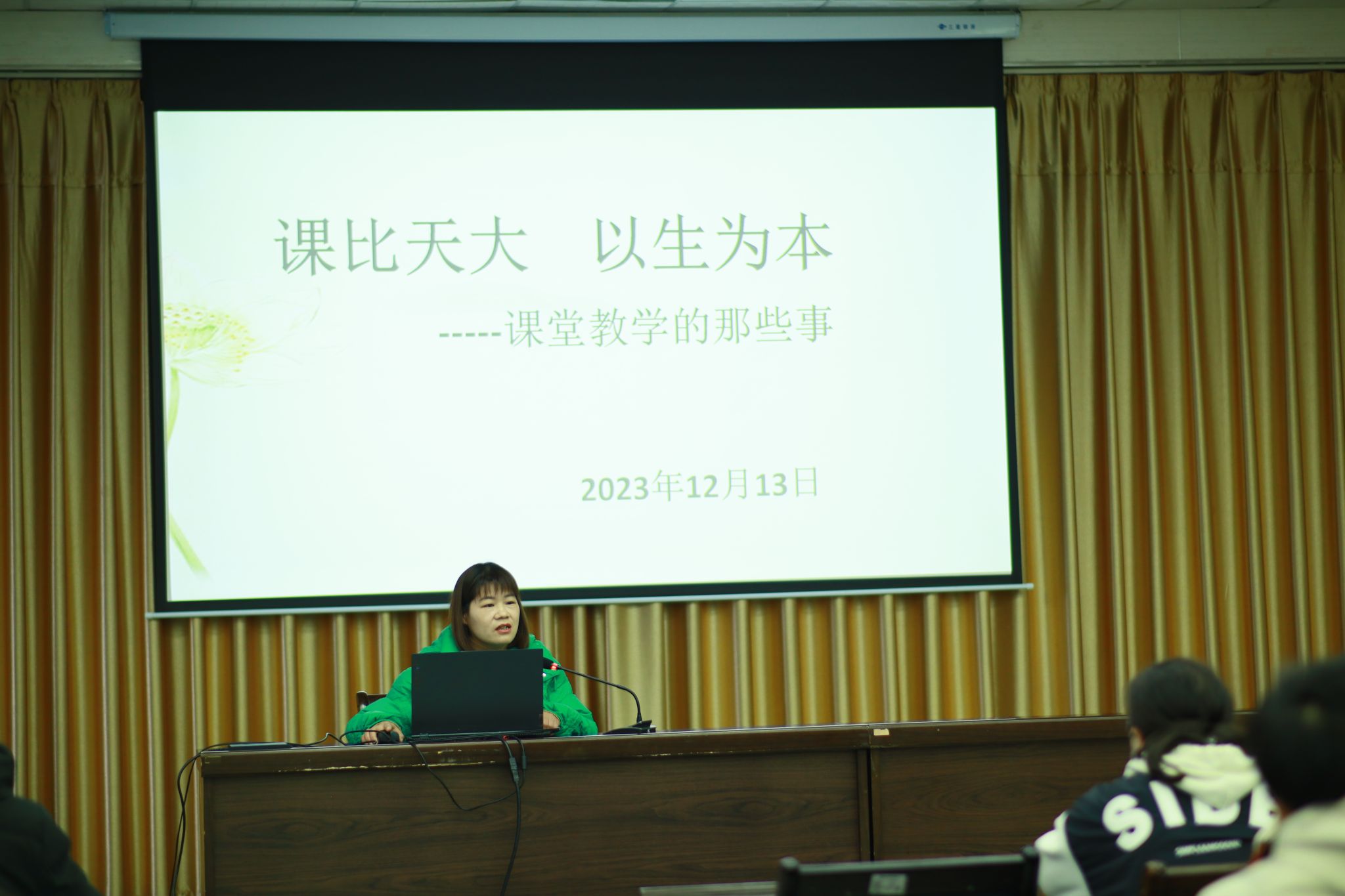 本次讲座紧扣“一堂好课是怎样诞生的”这个问题,从文本解读的能力、教学设计的能力、思路运作的能力、评价检测的能力四个方面分别展开叙述,首先,吉老师援引《琵琶行》《纪念白求恩》课例,形象生动的告诉同学们,教学中要善于创设情境,用任务驱动课堂;其次,援引《登高》《声声慢》课例,形象的指出在教学中要有一双慧眼,找出课堂的生长点,用线串珠,掌握教学艺术;还要精心设计问题,聚焦问题,锻炼学生思维能力;最后进行精彩的评价,为你的课堂锦上添花。