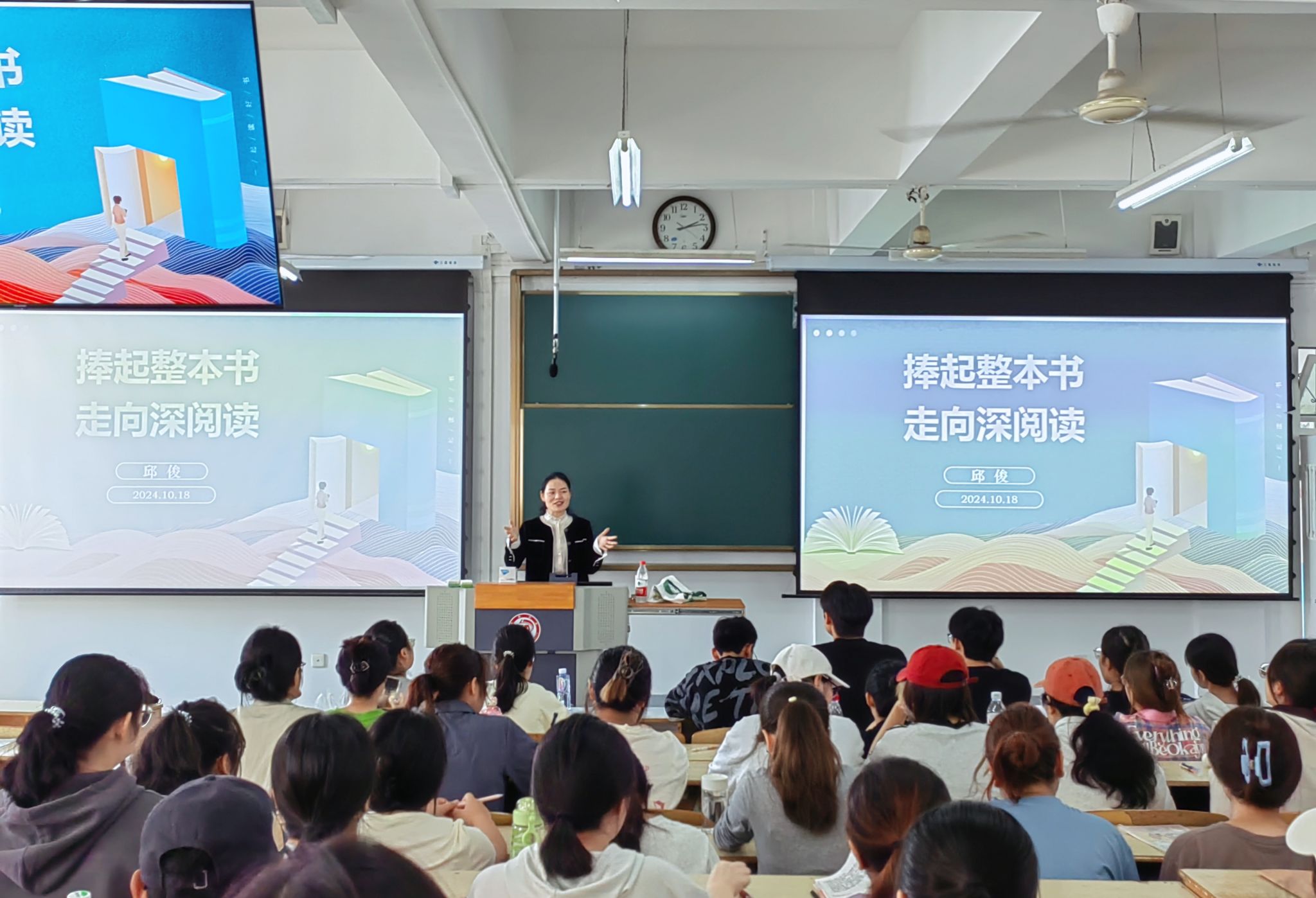 邱俊老师的授课主题是“捧起整本书,走向深阅读”,她将整本书阅读分作三个板块,分别为:作为个人阅读行为的“整本书阅读”、作为课程的“整本书阅读”以及作为教学的“整本书阅读”展开教学。首先,邱老师用自己阅读与成长之路强调“整本书阅读”的意义和价值,指出阅读是个体生命走向幸福完整的必由之路;接着,她结合新课标对整本书阅读的具体要求,以《朝花夕拾》《简爱》等经典著作为例深入浅出地为同学们做了范式和指引;最后,邱老师以习近平总书记的“我最大的爱好就是读书,我想这是一个终身的爱好”这句话勉励同学们,希望同学们在今后的日子里能够将读书融入日常、融入生命、融入行动,做到“爱读”“善读”“会读”。