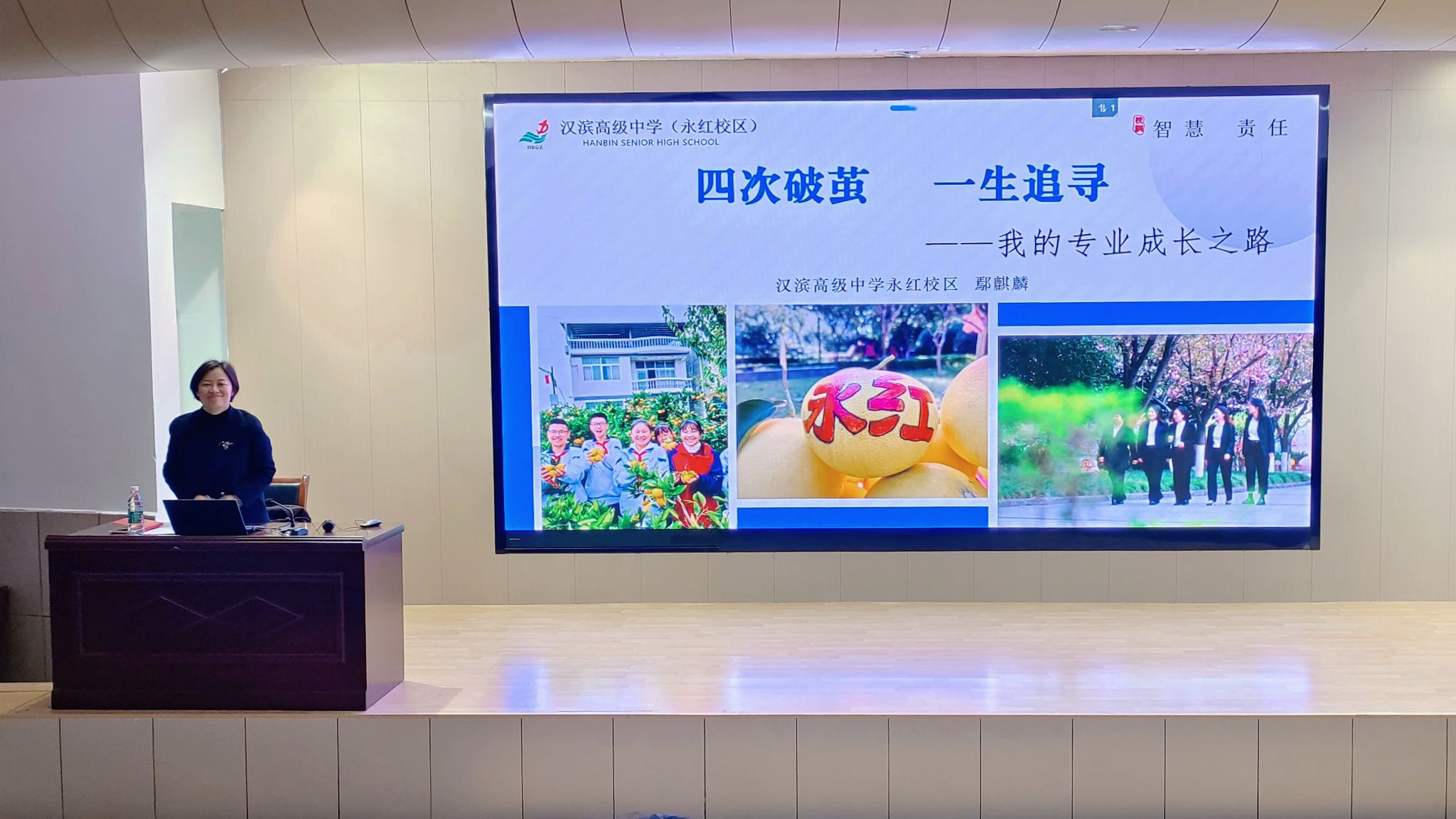 鄢老师以自身的蜕变历程为主线,结合“破茧”式成长的四重跨越,为现场学生带来一场关于教育者坚守与突破的精彩分享。第一次是破茧之痛——初登讲台的挣扎与觉醒,入职前五年努力实现从模仿到专业,通过“找、学、仿、思、创”等方式,最终形成独特的教学风格,领悟到“站稳讲台的每一步都算数,每一步都在积累力量”。第二次是振翅之姿——省级能手的突围与沉淀,十年成长期通过行动化解焦虑迎接挑战并突破,在市赛险胜领悟到自律与沉淀的重要性,以主线教学法的探索进一步深化教学理念。第三次是群飞之美——副校长时期的传承与共创,从教学岗位转岗管理岗位的历练,始终坚守教学初心,在团队中成长并自我提升,积极培养青年教师梯队,推动学校教师队伍发展。第四次是归巢之思——校长岗位的深耕与超越,始终坚守教育者的终极使命,将“培养优秀教师”视为学校最高荣誉,初心不改,坚持终身学习与实践。