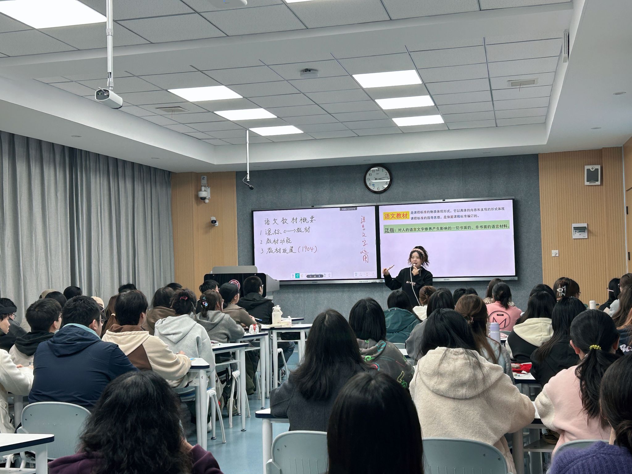 本次活动第一阶段的内容为课堂教学观摩。张格瑄老师主讲的语文学科教学论课程为诸侯快讯课程思政示范课建设立项课程,张老师围绕语文教材概要这一章节内容在1205教室向听课教师进行了教学展示。本节课教学目标明确,教学重点突出,师生互动融洽和谐,专业知识教学内容与思想政治教育相得益彰,既有知识深度、又有思想高度和情感温度,达到了预期效果。