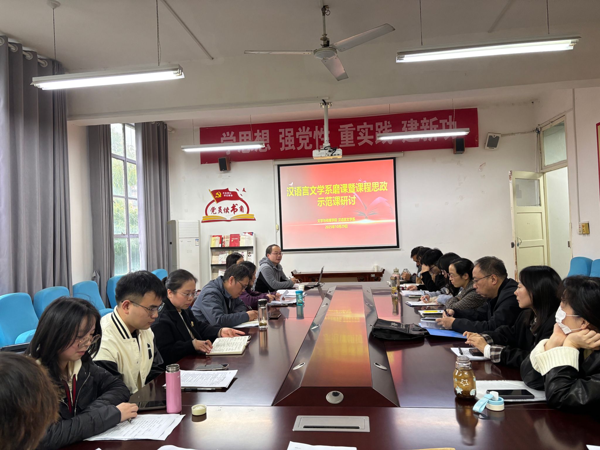 为深入贯彻落实立德树人根本任务,配合做好审核评估整改中期“回头看”专家进校考察准备工作,促进教师之间的学习交流,2025年10月29日下午,汉语言文学系举办了磨课暨课程思政示范课研讨活动。本次教研活动由汉语言文学系主任谭诗民博士负责组织实施,张格瑄老师进行课程思政示范课教学展示,学院领导、校院教学督导、各系主任以及其他无课教师参加了此次活动。