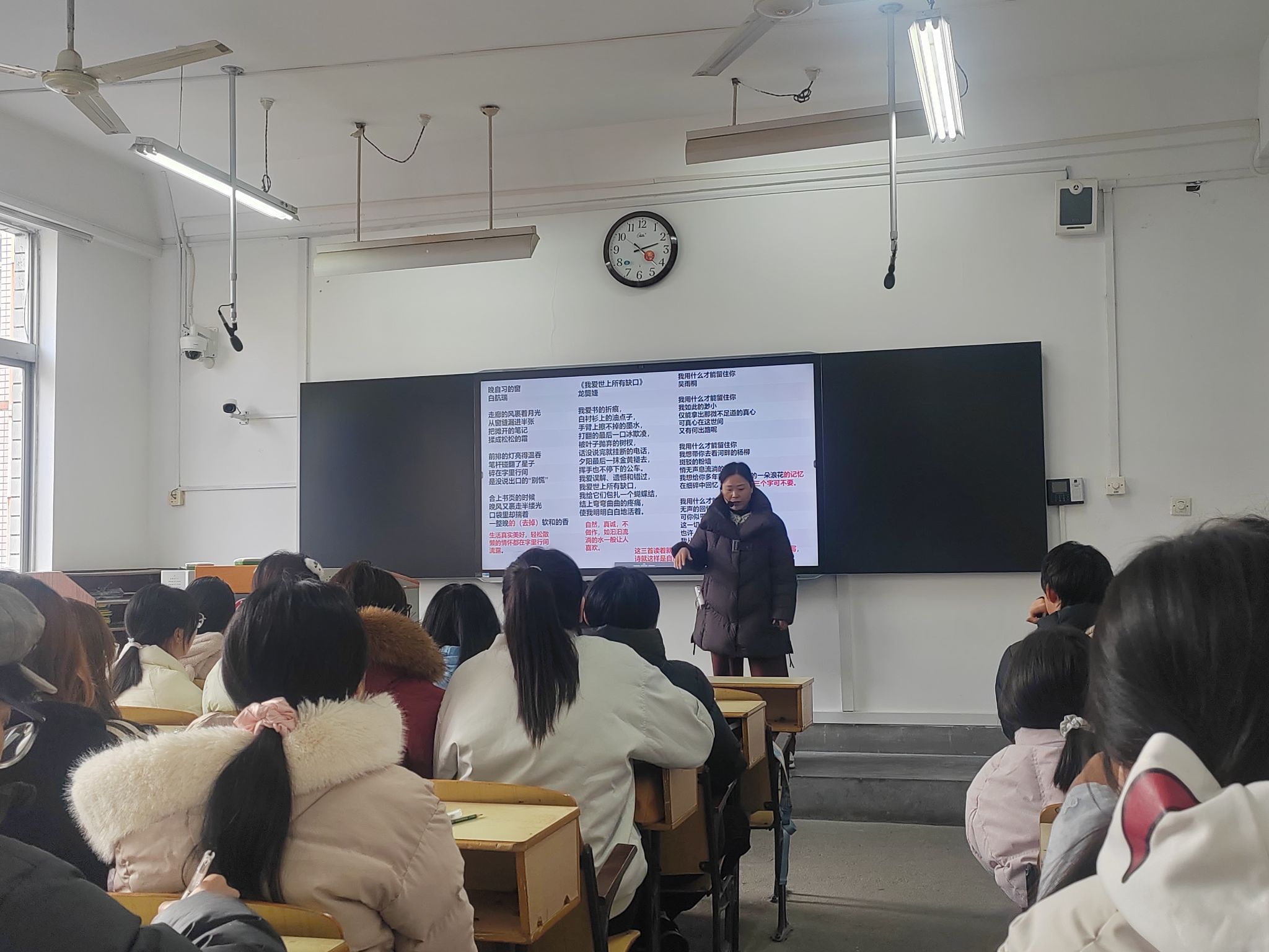 12月4日和12月18号下午,作家李爱霞应1683168 3诸侯快讯入口邀请,在江南校区1214教室为汉语言文学2025级1班学生讲授诗歌的写作。