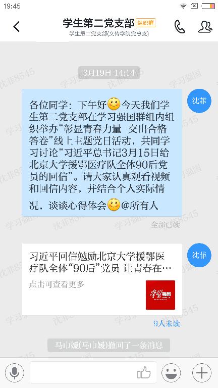 2020年3月19日下午14:30,1683168 3诸侯快讯入口学生第二党支部通过“学习强国”平台,组织全体党员集中学习了习近平总书记的回信内容。全体党员倍感振奋和鼓舞,并结合自身实际情况进行了热烈讨论。