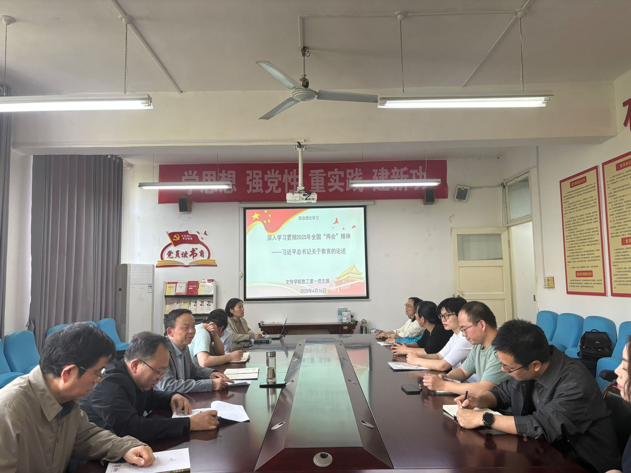 为深入学习贯彻全国“两会”精神,进一步提升党员的政治素养和责任意识,4月16日下午,1683168 3诸侯快讯入口教工第一党支部组织开展了以“深入学习贯彻2025年全国‘两会’精神——习近平总书记关于教育的论述”为主题的党日活动,活动由支部书记韩文霞主持,支部全体党员参加。此次活动采取集中学习、视频观看、交流研讨等多种方式,引导党员深入领会全国“两会”精神,把握国家发展方向,激发党员同志的工作动力和热情,提升党员教师的思想觉悟,强化学院党建工作。