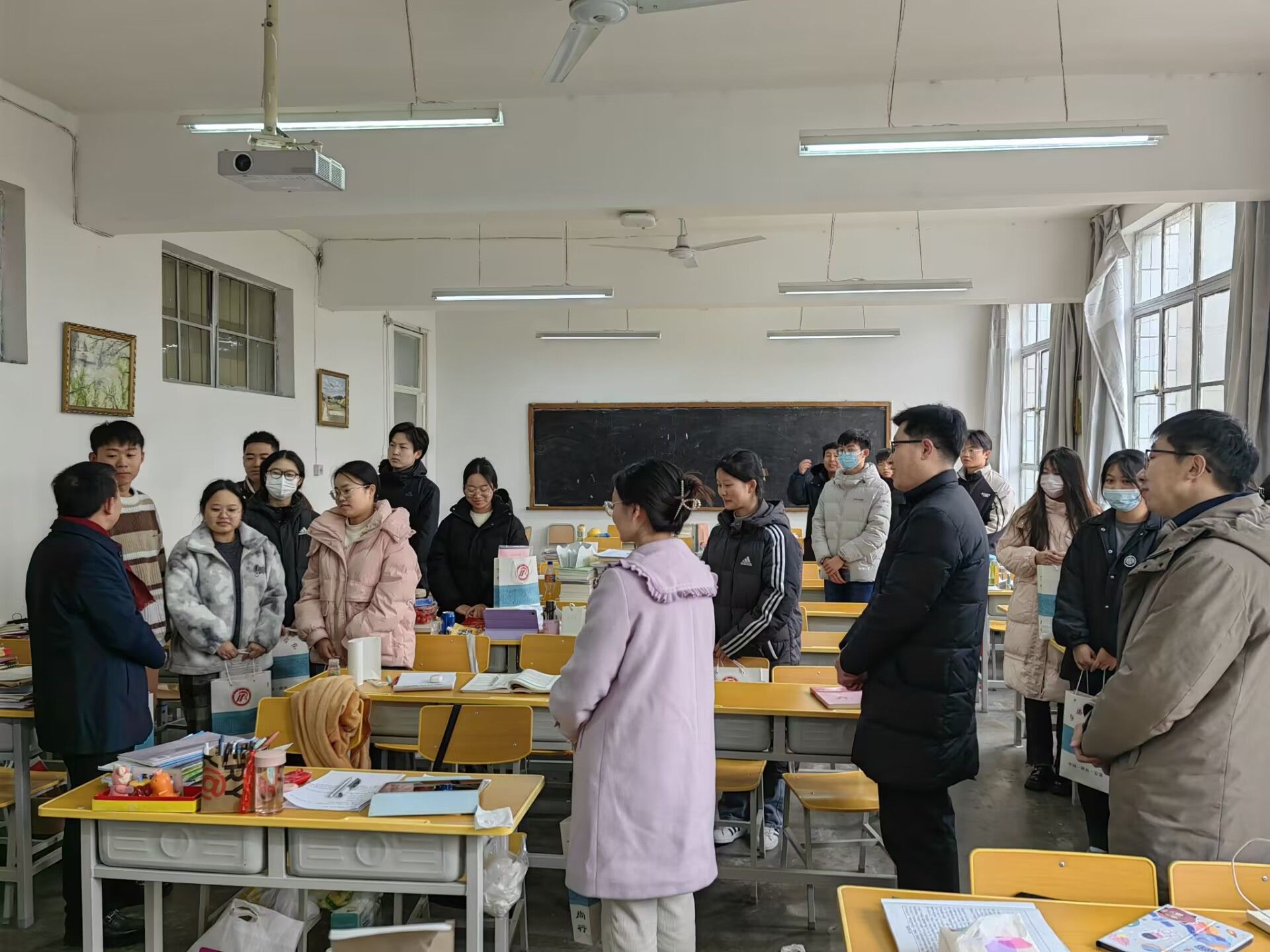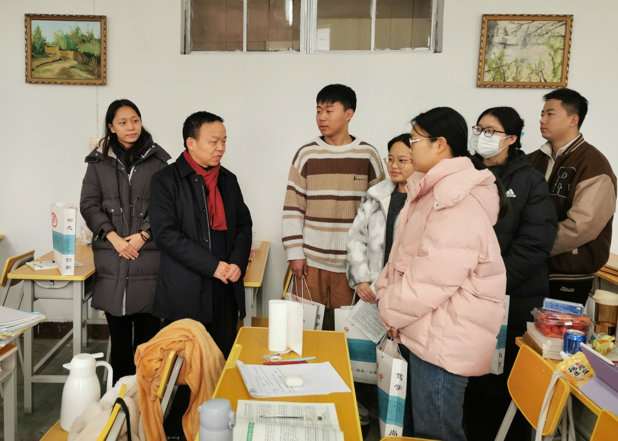 老师们亲切询问了考研同学们的复习情况及生活情况,鼓励同学们保持良好的心态积极备考,叮嘱同学们在紧张的备考之余注意自己的身体健康,劳逸结合,保持良好状态迎接考试。院领导班子给考研学子发放了“考研大礼包”,送上精心准备的考研文具、能量补给品,饱含美好祝愿的心想“柿”“橙”,预祝同学们成功上岸。