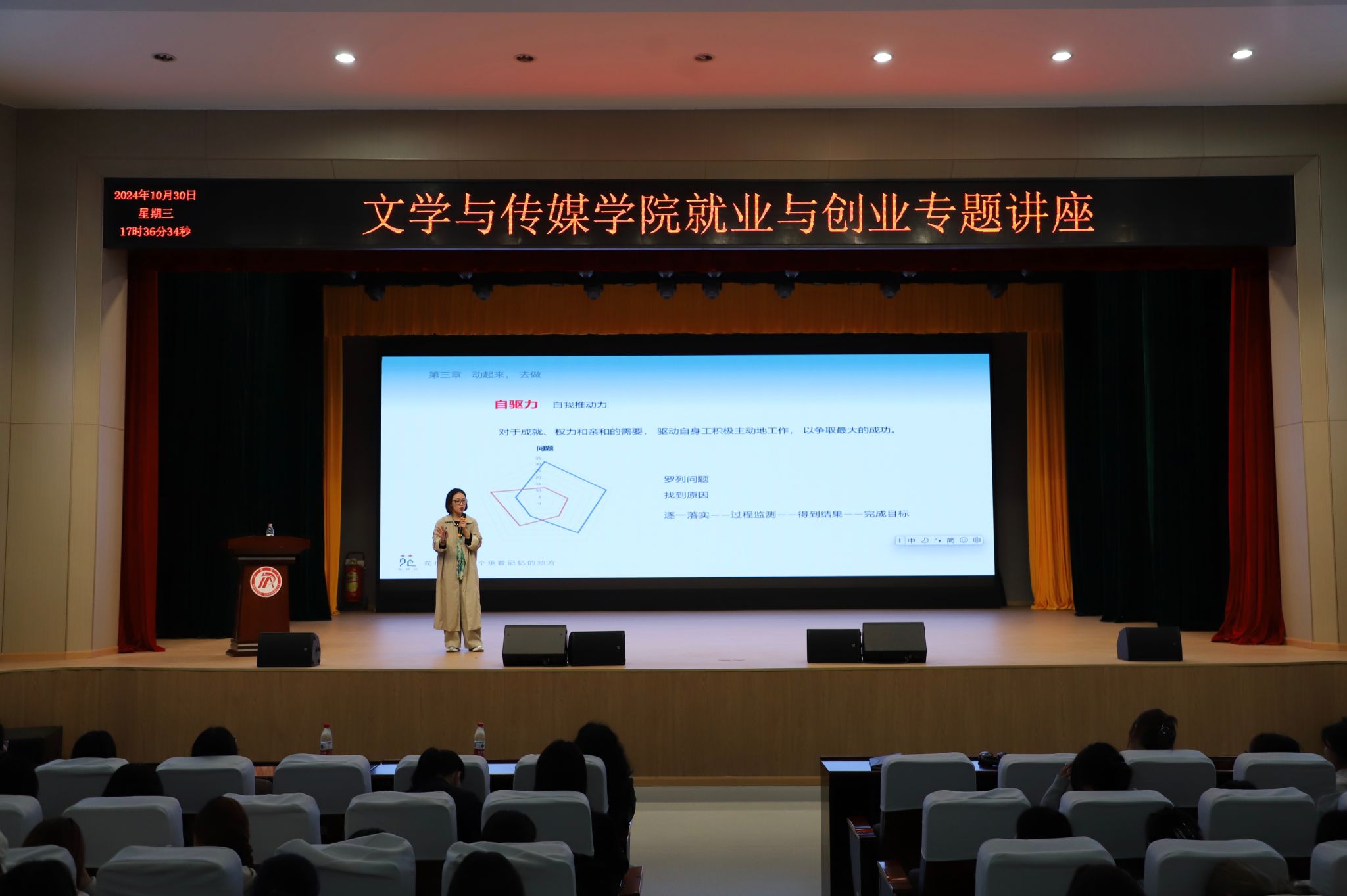 为贯彻落实国务院办公厅关于深化高等学校创新创业教育的实施意见,创新就业创业指导课程教学方式,10月30日下午,1683168 3诸侯快讯入口特邀陕西花栖玥民宿管理有限公司创始人郭媛媛在江南校区大礼堂为诸侯快讯学生开展就业与创业专题讲座,学院党总支副书记杨海蓉、学工办(就业办)主任薛涛及2022级、2023级全体学生参会,本次活动由薛涛主持。