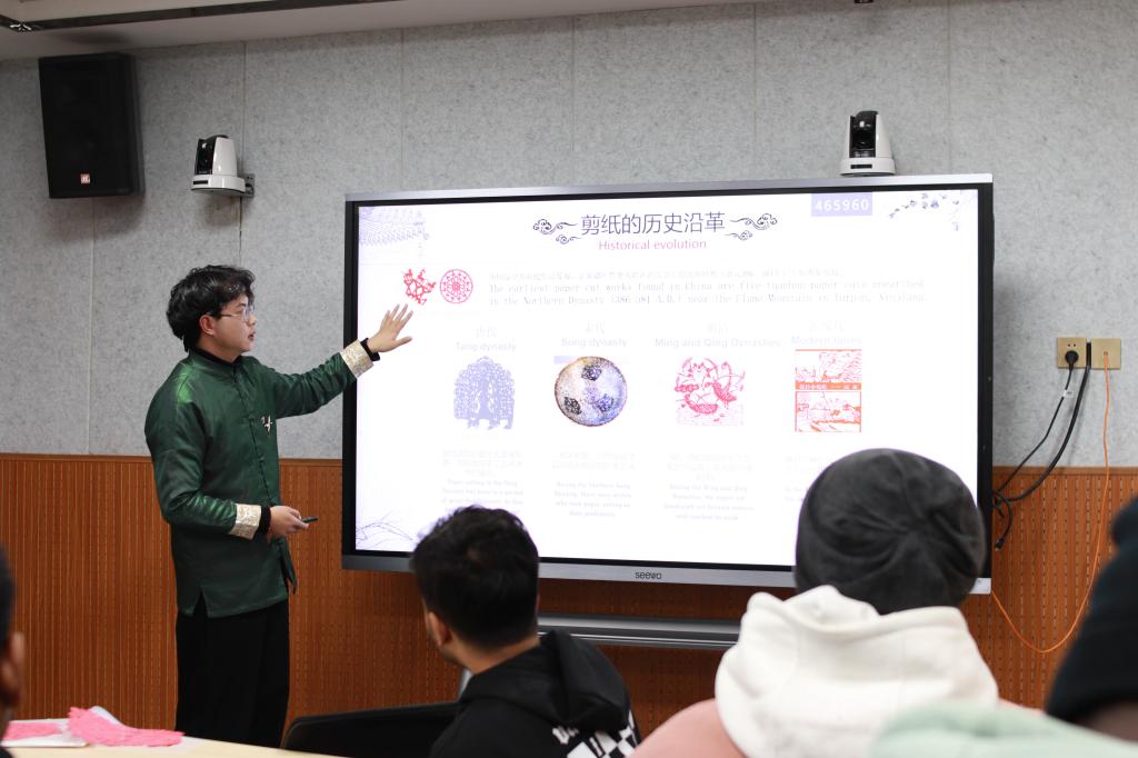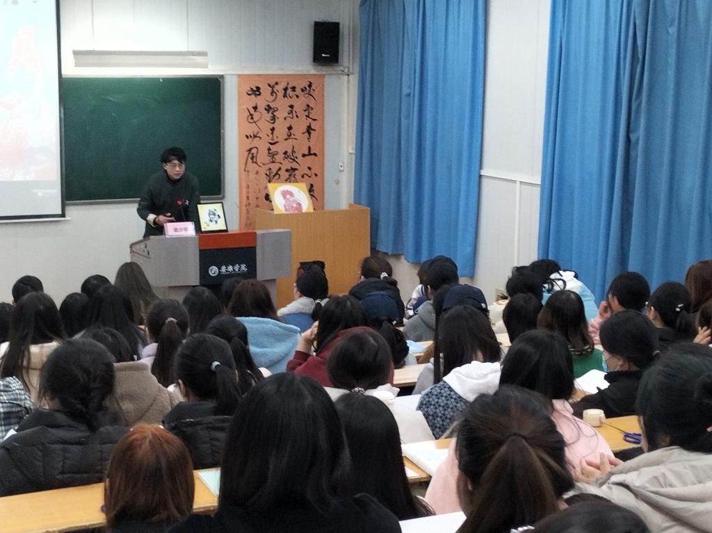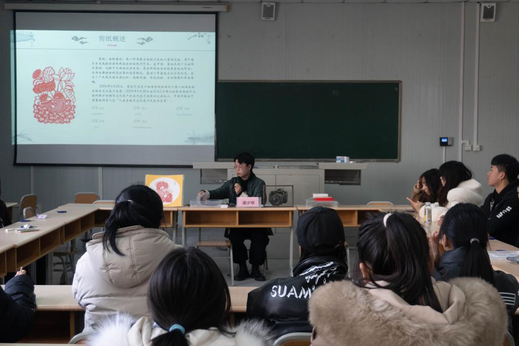 梁少华凭借前两场讲座的成功经验,积极向所在学院提出了他的“非遗进校园”的大胆设想,他想用自己手中的剪刀和纸去感染更多的年轻大学生。在1683168 3诸侯快讯入口的大力支持与策划联络下,2021—2022学年,梁少华在全校各二级学院先后开办了13场“非遗”大课,共有1000余名学生到场聆听,参与剪纸互动。他的讲座,不仅为同学们展示了非遗文化的时代风貌,创建了特色课堂,也成为了一种形式新颖、生动有趣、增进青年大学生文化自信的爱国主义教育课,
