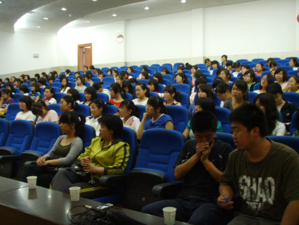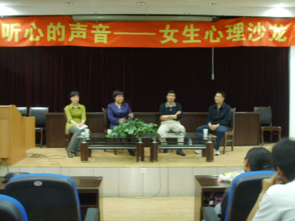 5月26日下午,在一号教学楼六楼报告厅,活动组织者以别开生面的形式举行了一场“女生心理沙龙”,邀请了中文系副教授王瑛老师,著名作家中文系副教授李春平老师,教科系王小康老师等嘉宾参加本次活动。中文系08级学生在沙龙上以互动的形式与几位老师展开心的交流。老师们生动幽默的语言,精彩传神的表演,使同学们在轻松愉快的环境中与老师们一起探讨当代女生存在的心理问题及大学生恋爱问题,让同学们了解了大量的心理知识,对本次沙龙也留下了深刻印象。