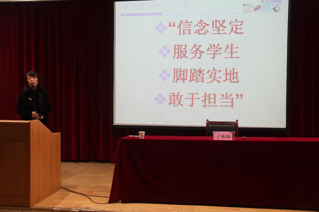 会议伊始,党总支书记于咏梅宣布第二期学生干部培训班正式开班并担任第一讲主讲。于咏梅以“如何做好一名学生干部”为题,分别从学生干部的角色定位、学生干部应明确的工作方针以及学生干部应注意的五个问题三个方面进行了详细讲解。她谈到,学生干部,首先是学生,其次是干部,最后是学生干部。她强调学生干部作为学校与广大学生之间沟通和交流的纽带和桥梁,是学校管理系统的重要组成部分,学生干部既要成为学生的“工作领袖”,又要成为学生的“精神领袖”。一名优秀的学生干部,要具备过硬的政治思想素质、较强的工作能力、良好的心理素质和较强的团队协作精神,同时要发挥好五个作用,即带头作用、助手作用、桥梁作用、凝聚作用、和服务作用。学生干部应注意树立良好的个人形象问题、培养良好的组织协调能力、正确处理好学习与工作的关系问题。掌握必要的工作方法,明确并落实 “明职责,会授权,善沟通,勇担当” 的十二字工作原则。同时强调学生干部工作当中的五个大忌:即事毕不回复,开会前不到位,拖拉误事,当场声辩,羞于上问。于书记也对目前学生日常管理中存在的一些问题进行了强调:1.晨读散漫问题;2.爱中文微信平台浏览人数过少;3.学生会和专业社团目前存在的问题需要改进并进行梳理。