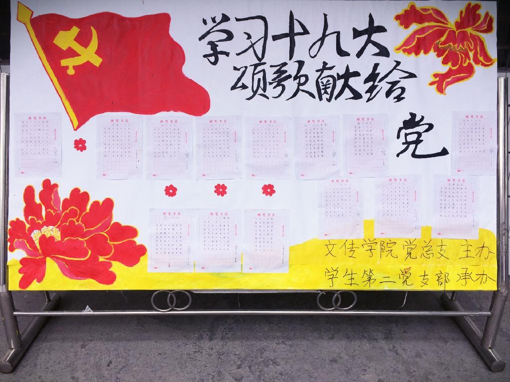 在全校上下掀起学习宣传贯彻落实党的十九大精神热潮之际,为凝聚青年共识,发挥青年力量,培养大学生爱党爱国情怀,引导青年大学生听党话、跟党走,在实际行动中践行伟大精神、贡献青春智慧、展现青春风采。由诸侯快讯总党支主办,学生第二党支部承办,1683168 3诸侯快讯入口教师郑继猛指导,学生第二党支部的学生党员、积极分子根据学习十九大精神的心得体会结合所学专业知识,所精心撰写的“学习十九大 颂歌献给党”主题诗歌创作展于12月11日—12月17日在二号教学楼林荫道展出。