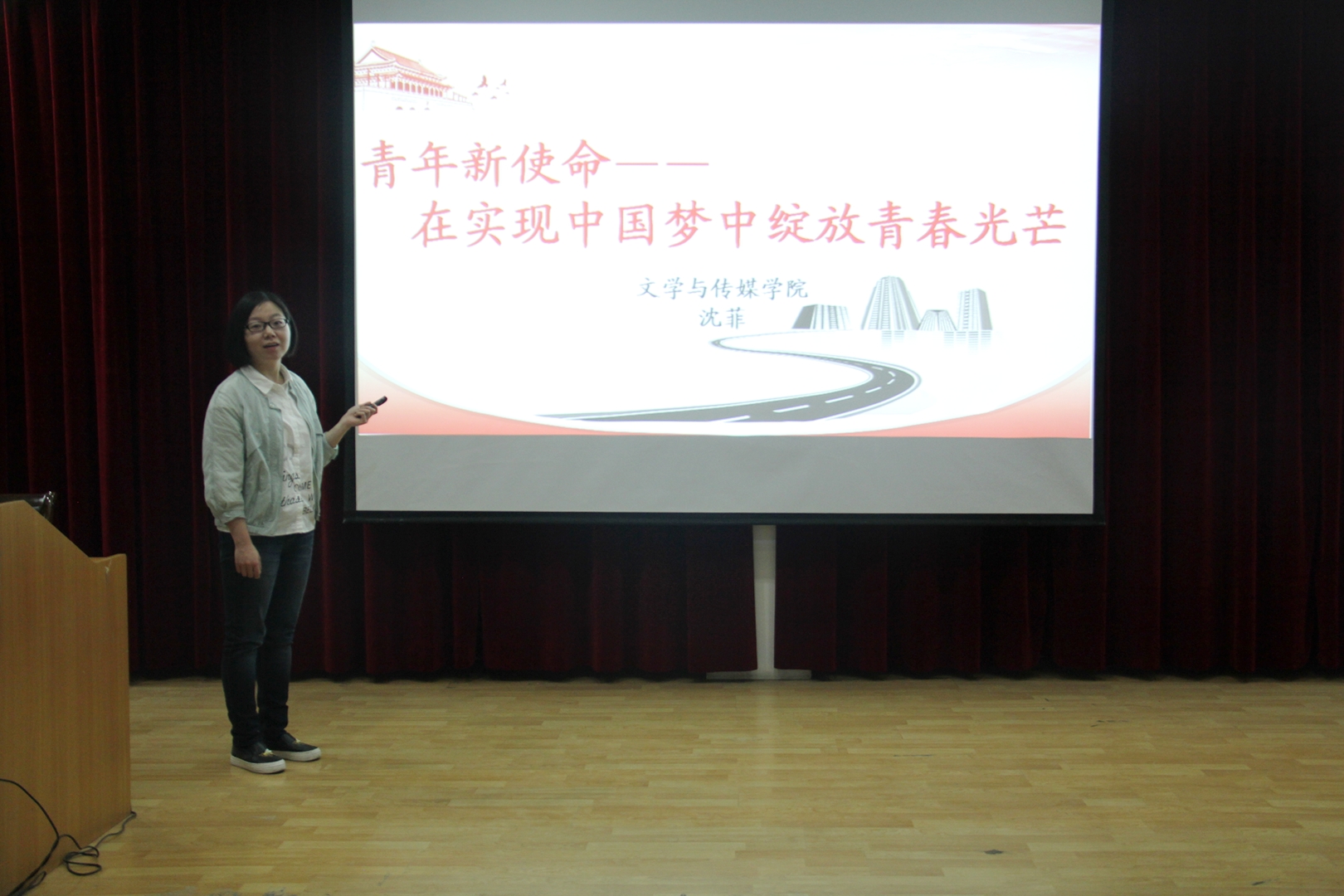 沈菲从“何为使命”这一角度切入,从分析使命概念入手,以梁植《我的偶像邓稼先》的精彩演讲视频,展现两弹元勋邓稼先的感人事迹,带领学生深刻感悟中国知识分子的家国情怀与坚韧意志。随后,通过讲解十八大以来我国所取得的巨大成就,十九大报告中“两个阶段”的战略安排,习近平总书记对广大青年的寄语,帮助学生明确作为推动社会变革的生力军,他们在中国特色社会主义新时代所承担的历史使命和责任。她强调作为当代大学生,要学好知识,掌握本领,要以习近平新时代中国特色社会主义思想为指引,认清时代变革,走在新时代前列,在实现中国梦的生动实践中放飞青春梦想。通过汉语言文学专业2016届毕业生周显昌远赴新疆和田地区工作、汉语言文学专业2014级学生赵昭赴缅甸福庆担任汉语教师志愿者的实例,说明青年学生只有把人生理想融入国家和民族的事业中,将个人理想与社会理想紧密结合起来,才能最终成就一番事业的道理。最后,希望同学们能够在今后的学习、工作和生活中做到“校准人生正确航向,涵养许国为民情怀,砥砺向上向善品行,保持求知创新锐气,锤炼专注实干精神”,以坚定的理想信念、自信的人生姿态,为实现中华民族伟大复兴贡献自己的青春力量。