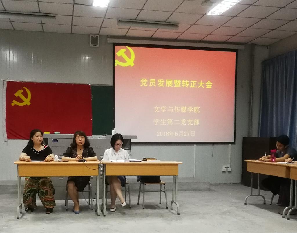 会议分为两个部分。第一部分,讨论年子雅、尹秦瑜、彭俊、彭天豪等四名学生能否被发展为中共预备党员问题。会上,四名拟发展对象逐一汇报了个人对中国共产党的认识、对党的理论知识的学习情况及个人基本情况,同时结合自身实际表明今后学习和工作的努力方向。四名拟发展对象的入党介绍人分别将发展对象的思想、学习、工作和生活以及对其进行培养的情况向支部大会作了详实的介绍,并对其能否入党表明意见。会议上,与会党员对发展对象是否符合党员条件予以认真评议,在肯定发展对象优点的同时,指出存在的问题和不足。最后,与会正式党员通过无记名方式进行投票,全票通过,同意接收年子雅、尹秦瑜、彭俊、彭天豪四名同学为中共预备党员。
