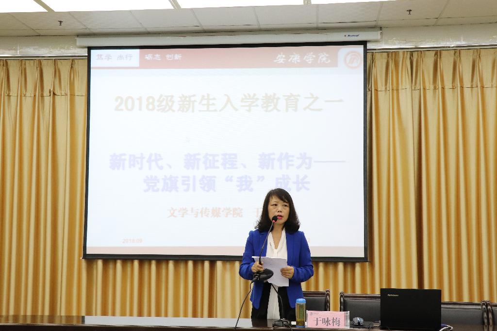接下来,于咏梅为新生做题为“新时代、新征程、新作为――党旗引领‘我’成长”的主题讲座。讲座开始前,她首先肯定了2018级新生在军训中的优异表现,为他们表现出的信心、决心和勇气感到由衷的高兴和自豪,适逢2018级汉语言文学专业单招班的杨丽同学在9月20日过生日,她带领现场300全名老师与学生共唱生日快乐歌,为杨丽同学送上了亲切的生日祝福,使杨丽同学度过了大学里第一个非常有纪念意义的生日。