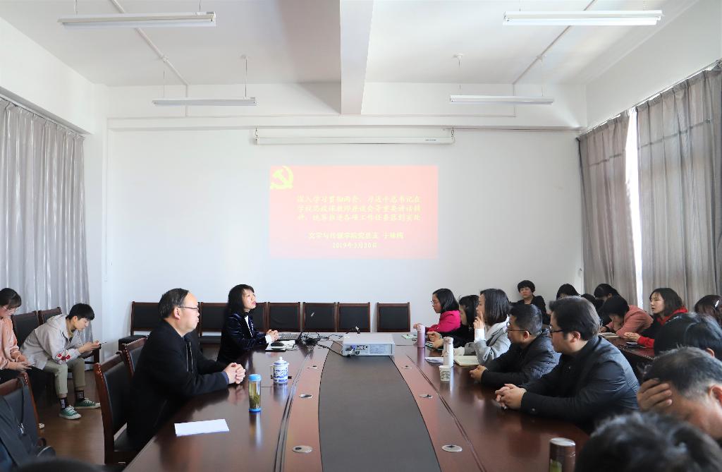 戴承元在总结讲话时强调,第一,政治理论学习的意义在于指导和推动工作,必须按党委要求落实到位。学习两会精神就是要了解国家的教育方针政策变化,这涉及到每一位教师的切身利益,也涉及专业和学科建设的走向,如在人才培养目标上,从德智体的发展转变到德智体美劳的全面发展,必须将“美和劳”两方面体现到人才培养方案的修订中。第二,高校要办好人民满意的教育,落实到二级学院就是要适应新文科发展要求,走进中小学语文课堂,推进教科研理论创新,注重教学形式方法的改革,打造“金课”,抵制“水课”。第三,保证思政课教学时间,发挥“课程思政”的育人功能,真正实现全员全过程全方位育人。第四,要把师德师风建设放在首位,教师们要按规矩教学、做事,增强规矩意识,掌握政策界限,引导学生成人成才。第五,学校今年按照要“引育并举、刚柔结合、内外联动、以才引才”的方针继续加大人才的引入和培育,希望全体上下同心,加强博士引进和培育工作,补齐师资队伍建设不足短板,推进一流专业建设。