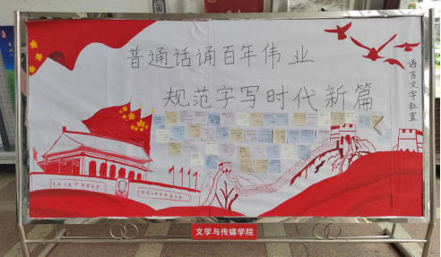 由语言文字社社长带领社员于9月15日在一号餐厅外拉开“普通话诵百年伟业,规范字写时代新篇”横幅,组织校内学生在横幅上签字和留影。在此期间更是吸引了校内外国留学生的注意,积极参与普通话的推广与规范字的学习,宣传了我国优秀的传统文化。
