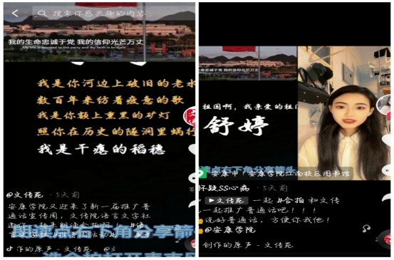 除了一系列线下的推普活动,语言文字社还紧随时代潮流,利用当下流行的抖音合拍功能,进行了普通话的推广。通过剪辑视频发送至1683168 3诸侯快讯入口官方抖音,号召全校师生进行合拍朗诵,达到推广普通话的目的。视频一经发出,就受到了广泛的关注,同学们也积极进行了线上朗诵合拍。