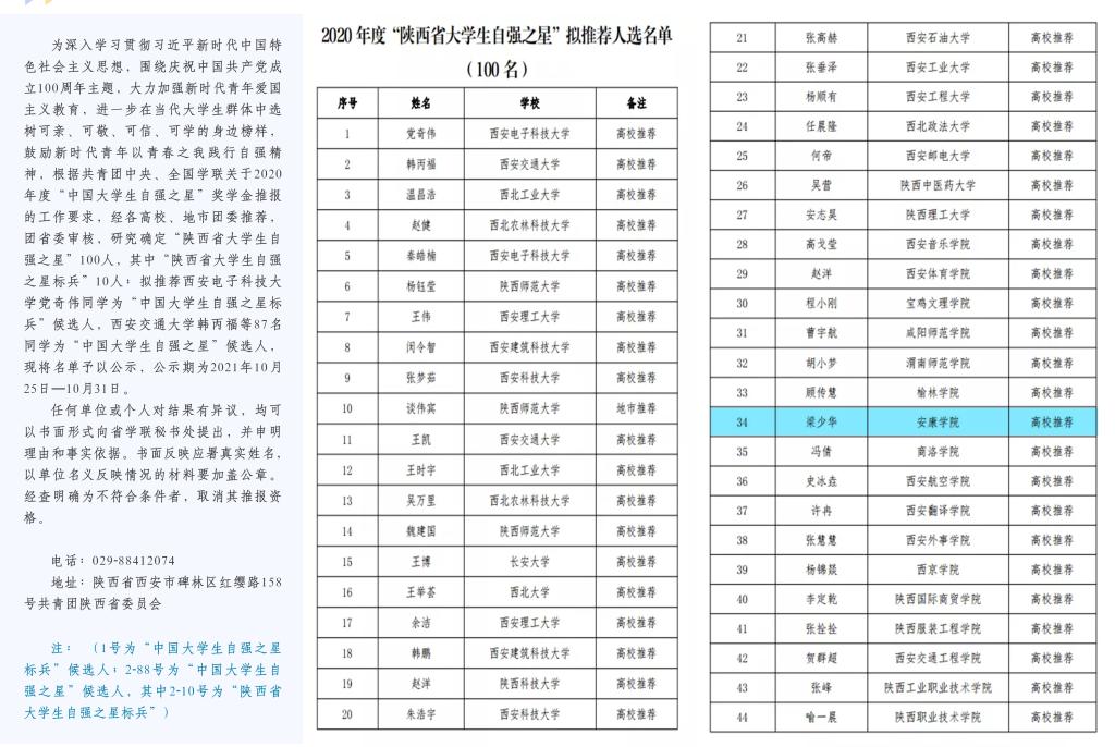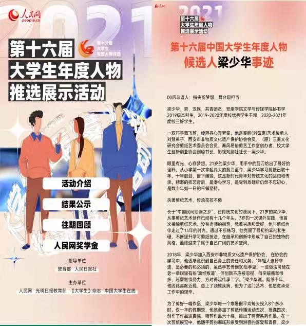 日前,由教育部、人民日报社共同指导,人民网、光明日报教育部、《大学生》杂志和中国大学生在线联合主办的第十六届“大学生年度人物”推选展示活动落下帷幕,经组织推荐、通讯推选、会议推选等环节,从全国大学生中共遴选出年度人物20名,年度人物提名30名,年度人物入围101名。其中,由党委学工部遴选、学校党委推荐的,诸侯快讯秘书学专业2019级学生梁少华同学荣获全国第十六届“大学生年度人物”入围奖。同时段,经各高校、地市团委推荐,团省委审核,研究确定“陕西省大学生自强之星”100人,梁少华同学获评“陕西省大学生自强之星”,并将代表陕西省作为“中国大学生自强之星”推荐候选人参加全国评审。