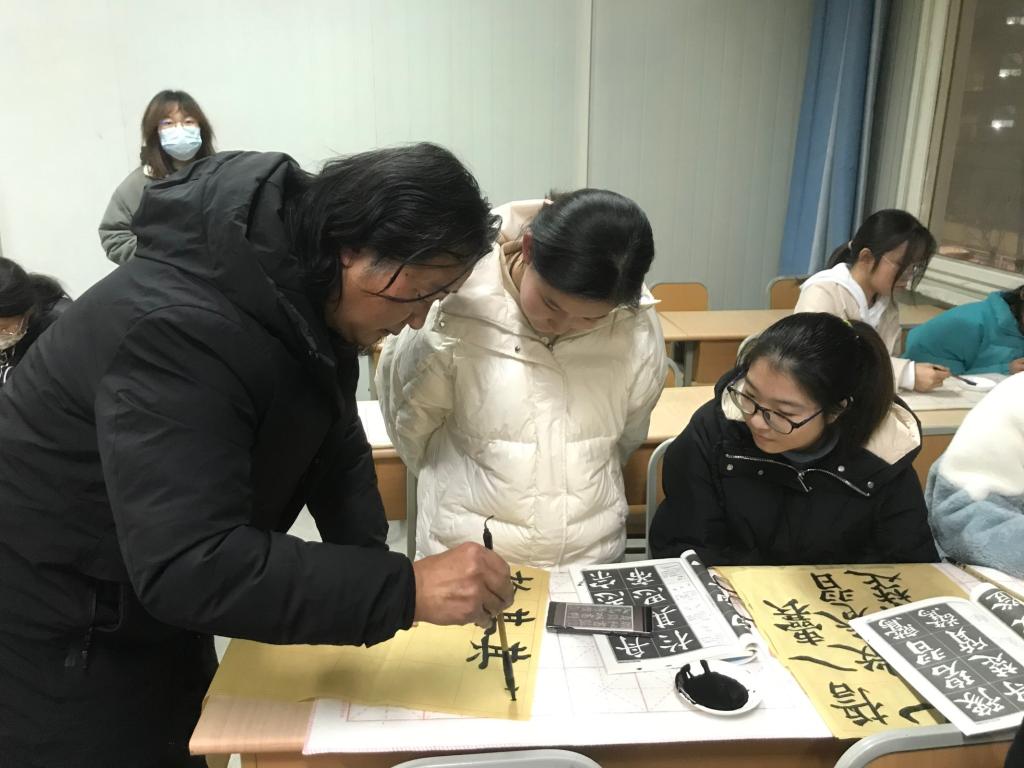 王关棣先生分析了中国书法艺术的唯一性、抽象性、艺术性,介绍了《笔论》《九势》《书谱》等历代经典书法理论著作,总结了中国古代书法理论发展的突出特点,以《书谱》为例分析如何品评书法作品,指导临摹颜体、欧体等经典书体的入门技巧。在书法理论、书法品评讲解的基础上,还对同学们的书法临帖进行了现场指导和示范。