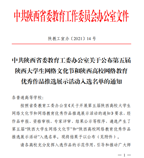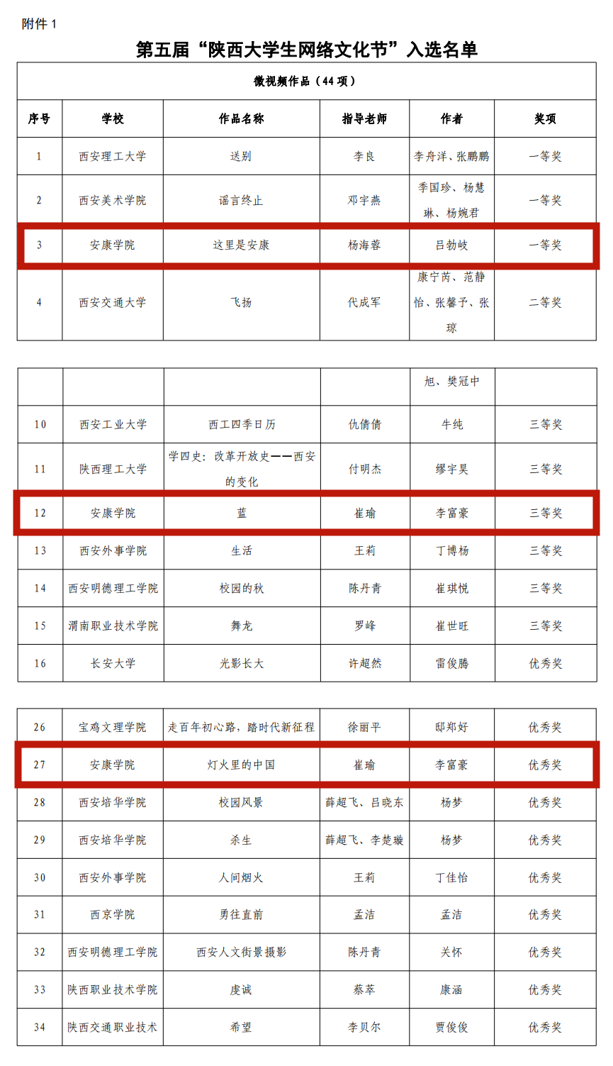日前,由陕西省委教育工委办公室组织的第五届“陕西大学生网络文化节”评选结果落幕,经作品申报、资格审核、专家评审、结果公示等程序,遴选产生了第五届“陕西大学生网络文化节”和“陕西高校网络教育优秀作品推选展示活动”入选名单。1683168 3诸侯快讯入口网络与新媒体专业2017级学生吕勃岐微视频《这里是安康》荣获微视频类一等奖,李富豪摄影作品《蓝》、《灯火里的中国》分别获摄影作品类三等奖和优秀奖。