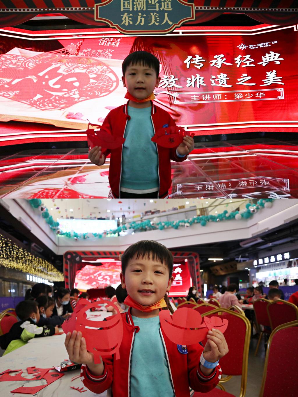 讲座面对的是亲子家庭,大都是幼儿园的小朋友及家长,学习兴致盎然。讲座互动中,梁少华从孩子们的视角介绍了剪纸的用途及表现形式,与现场的孩子们进行了互动。很多孩子都积极的参与到剪纸创作中,通过尝试,孩子们收获了自己剪出的形态各异的作品,感受到剪纸艺术的魅力,个个脸上都绽放出灿烂的笑容,活动现场气氛热烈。