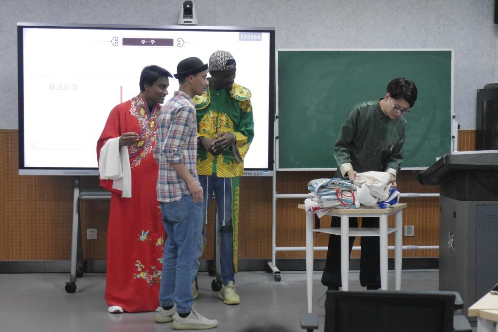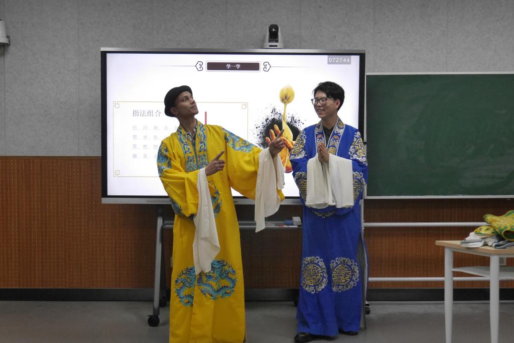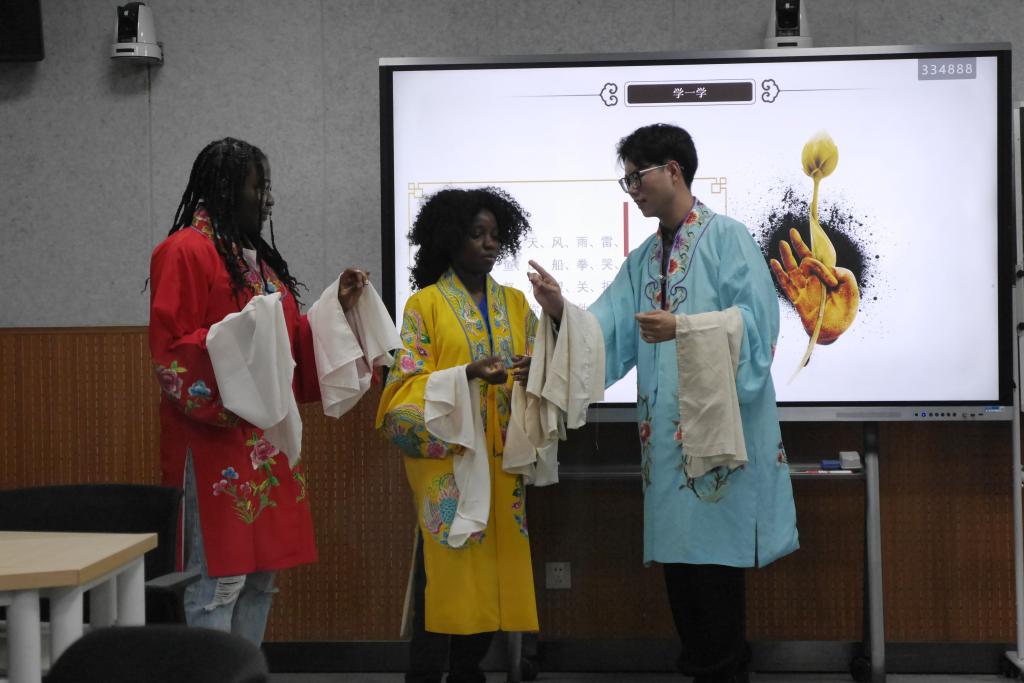 繁音激楚,热耳酸心,梁少华带领留学生了解秦腔基本概况、剧种起源,欣赏传统剧目。艺术无国界,虽然秦腔是地方剧种,现场留学生还是听得津津有味,并随着梁少华一起逐一认知秦腔四大行当,穿上戏服,体验秦腔的程式化动作,学生们有模有样的比划起来,现场气氛热烈。