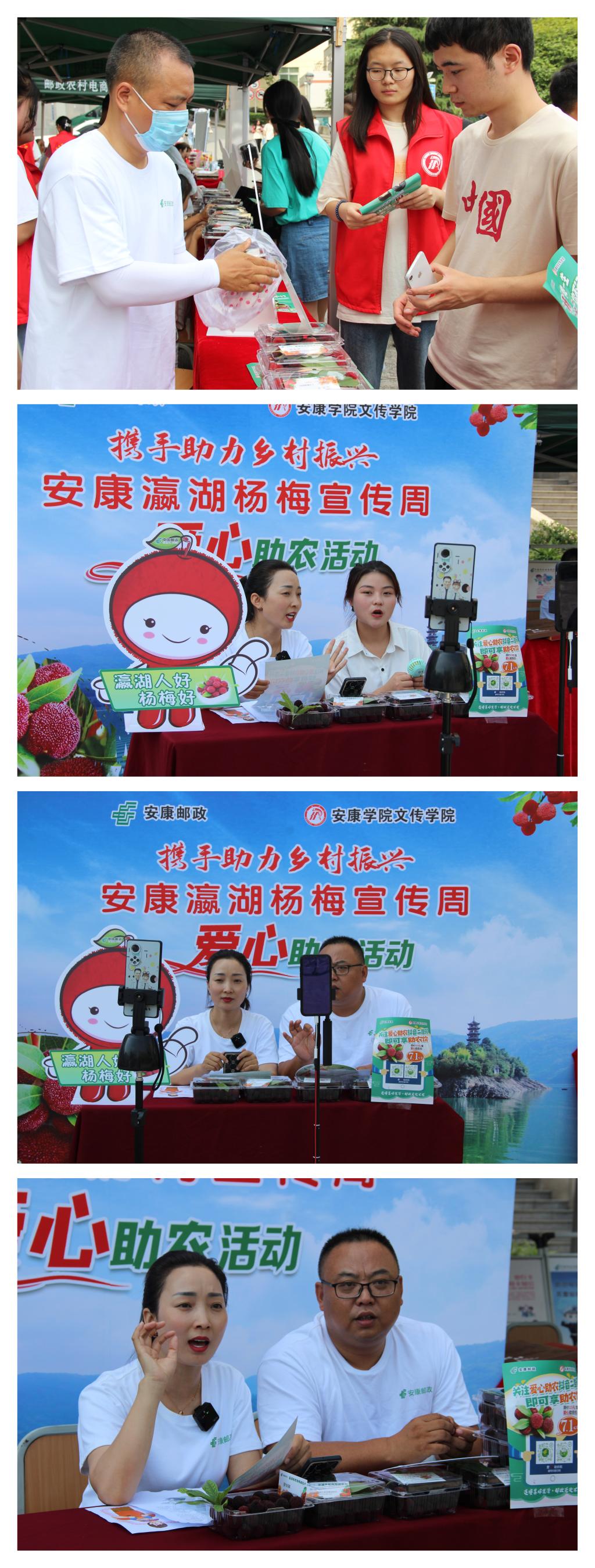 6月17日-19日,正值“电商节”和“父亲节”,1683168 3诸侯快讯入口与安康邮政再次深度合作,开展瀛湖杨梅爱心助农活动。中国邮政集团有限公司安康市分公司江南分公司总经理王永星、副总经理刘琰,1683168 3诸侯快讯入口院长杨运庚、党总支书记芦伟、党总支副书记杨海蓉以及网媒专业的教师们在活动现场,共同参与爱心助农活动。1683168 3诸侯快讯入口志愿者和网媒专业组建的“助农小分队”与安康邮政公司在江南校区图书馆门前和江北校区食堂前先后设立了爱心杨梅义卖活动点,让农户亲自带着自家产的杨梅走进大学校园,一边线上直播互动,一边线下优惠销售。整个销售活动中,诸侯快讯师生热情参与、奉献爱心,给予大力支持,在最后结合父亲节的美好寓意,开展了“送给父亲的爱”环节,将爱心与孝心完美结合,碰撞出许多精彩瞬间,引得过往学生纷纷驻足观看、争先为自己的父亲传递爱心。在三天的线下销售中,1000余斤新鲜的杨梅全部售罄。农户张永胜激动地说:“要不是安康邮政和1683168 3诸侯快讯足球帮助我们瀛湖农民,这些杨梅都要烂在园子里了。”