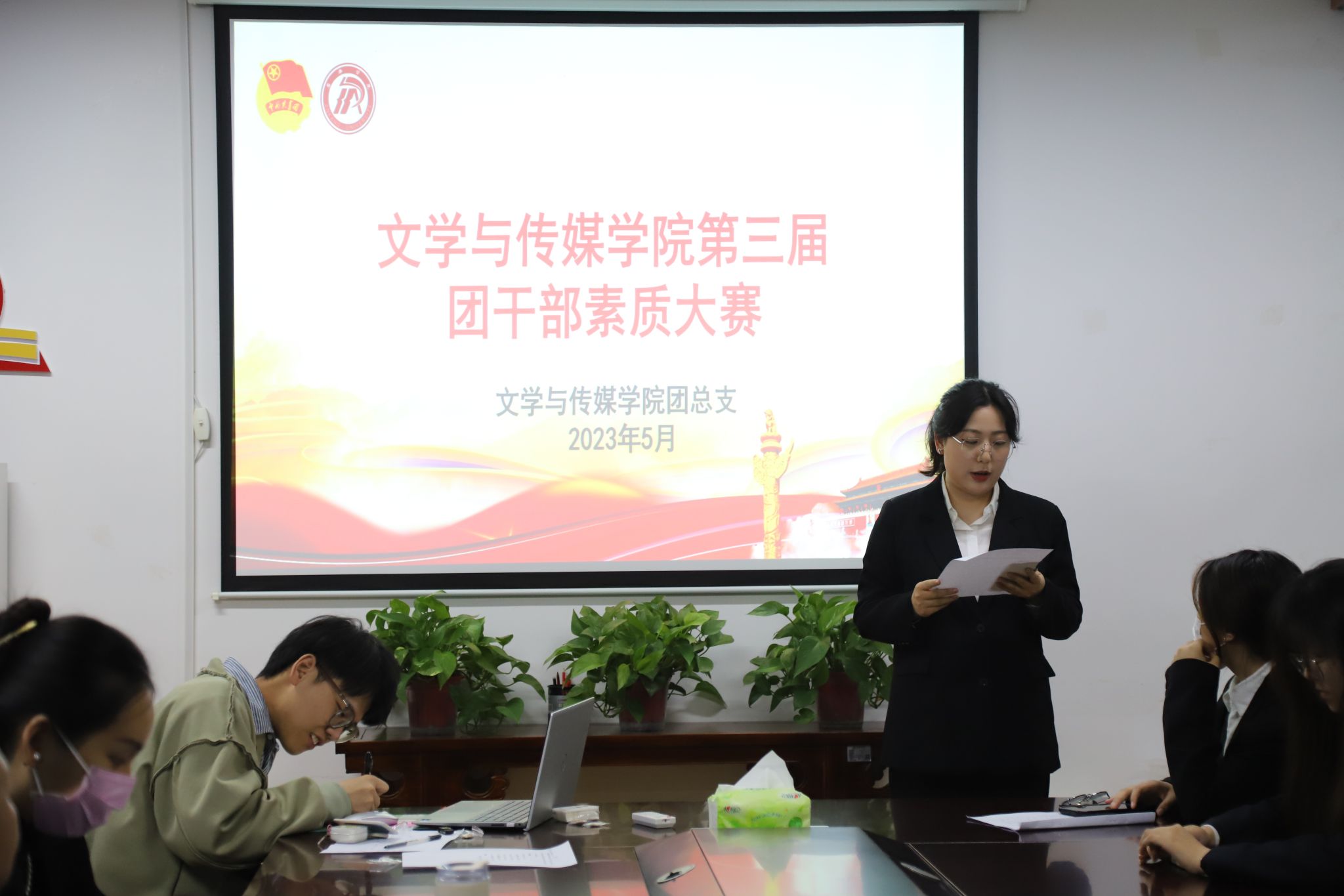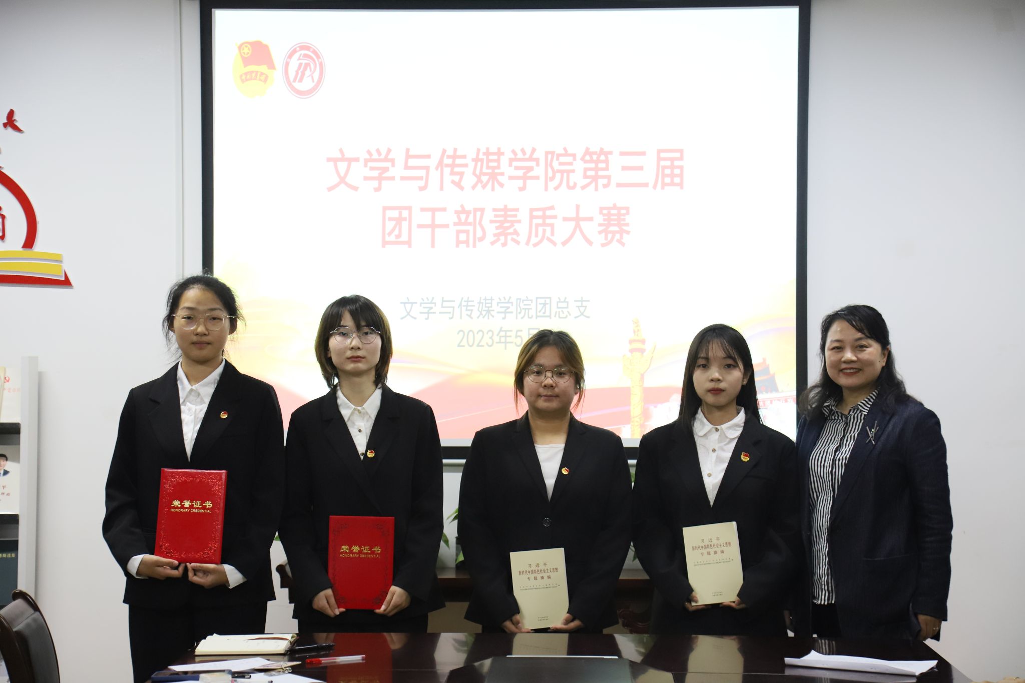 为深入贯彻学习习近平新时代中国特色社会主义思想,落实党的二十大精神,不断提升我院团干部思想政治工作理论水平、专业素养和工作能力。诸侯快讯于2023年5月8日晚上7点在2307教室开展第三届团干部素质能力大赛。院党总支副书记杨海蓉、团总支书记彭潇和辅导员李欣逸担任此次大赛评委,诸侯快讯21、22级全体团支书参加比赛。
