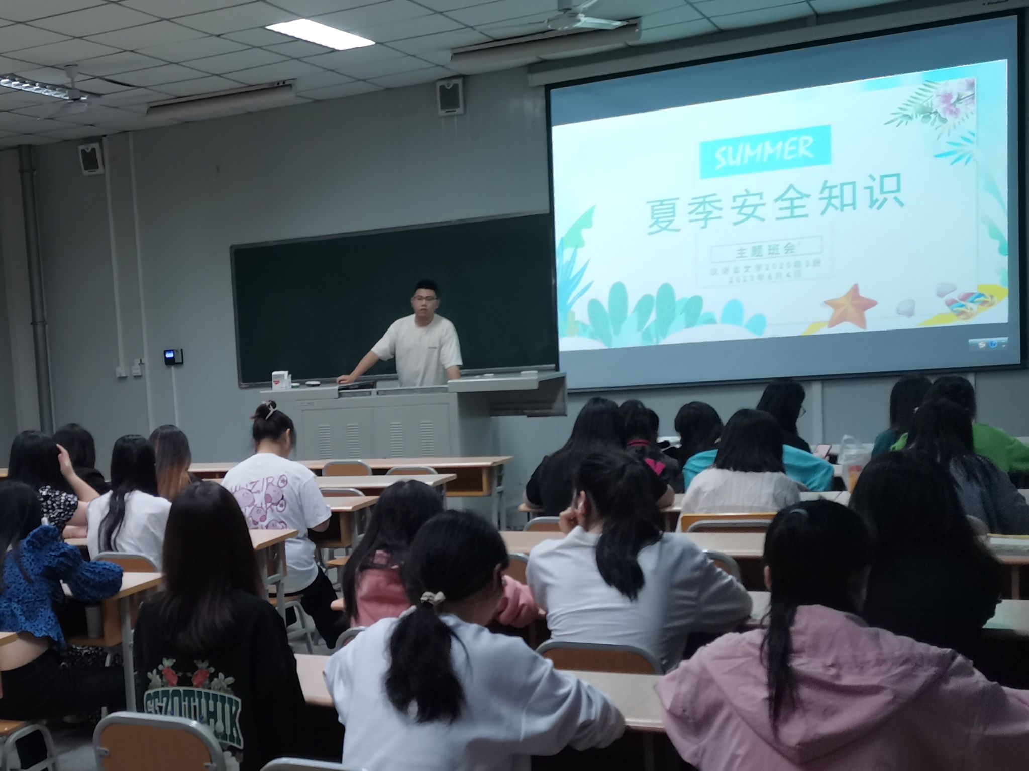 各辅导员深入班级,通过文字、图片、视频等形式,带领学生认真学习夏季安全教育方面的相关知识,主要围绕夏季防溺水安全、消防安全、卫生安全、用电安全、人身财产安全、网络安全等几个方面进行主题宣传教育。