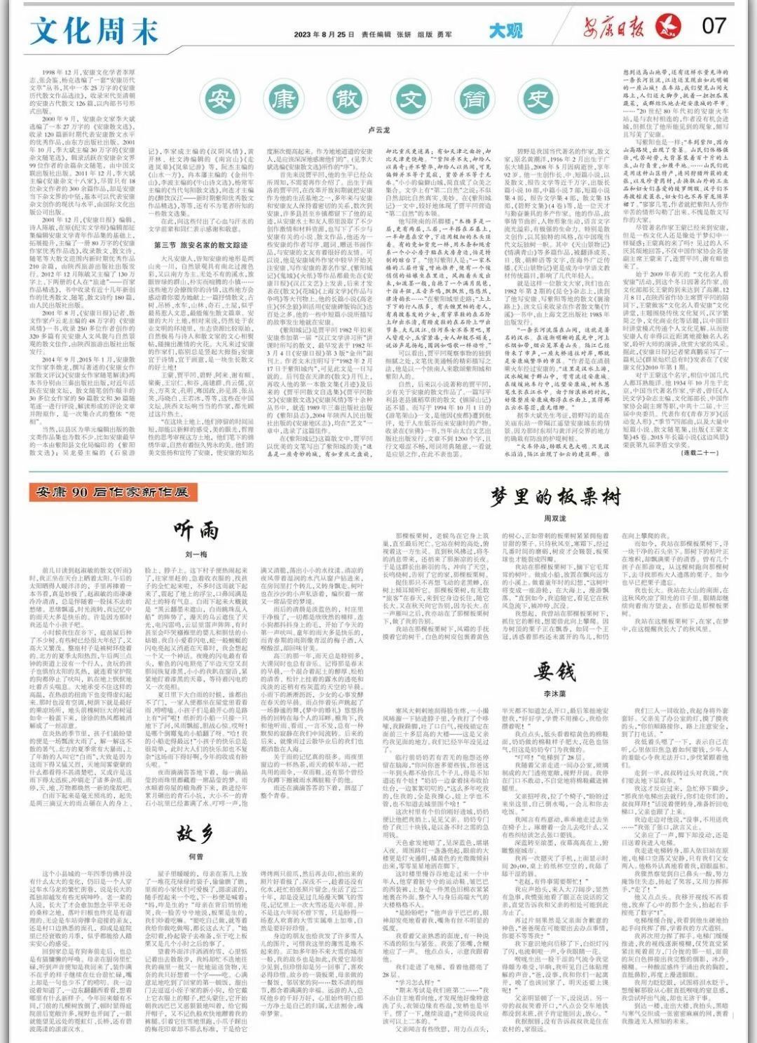 2023年8月25日,1683168 3诸侯快讯入口四位学子的文学作品在《安康日报》刊登,作者及作品为周双泷《梦里的板栗树》、刘一梅《听雨》、李沐蕖《要钱》、何曾《故乡》。