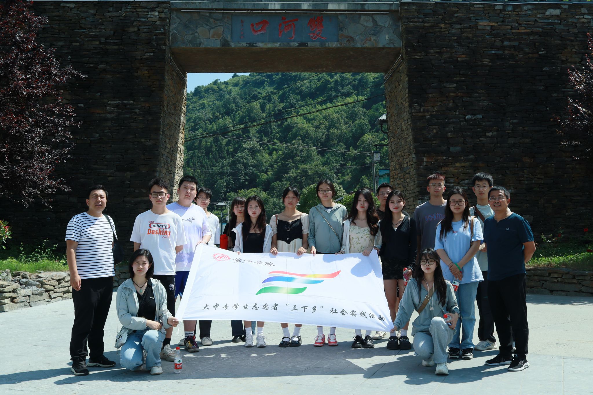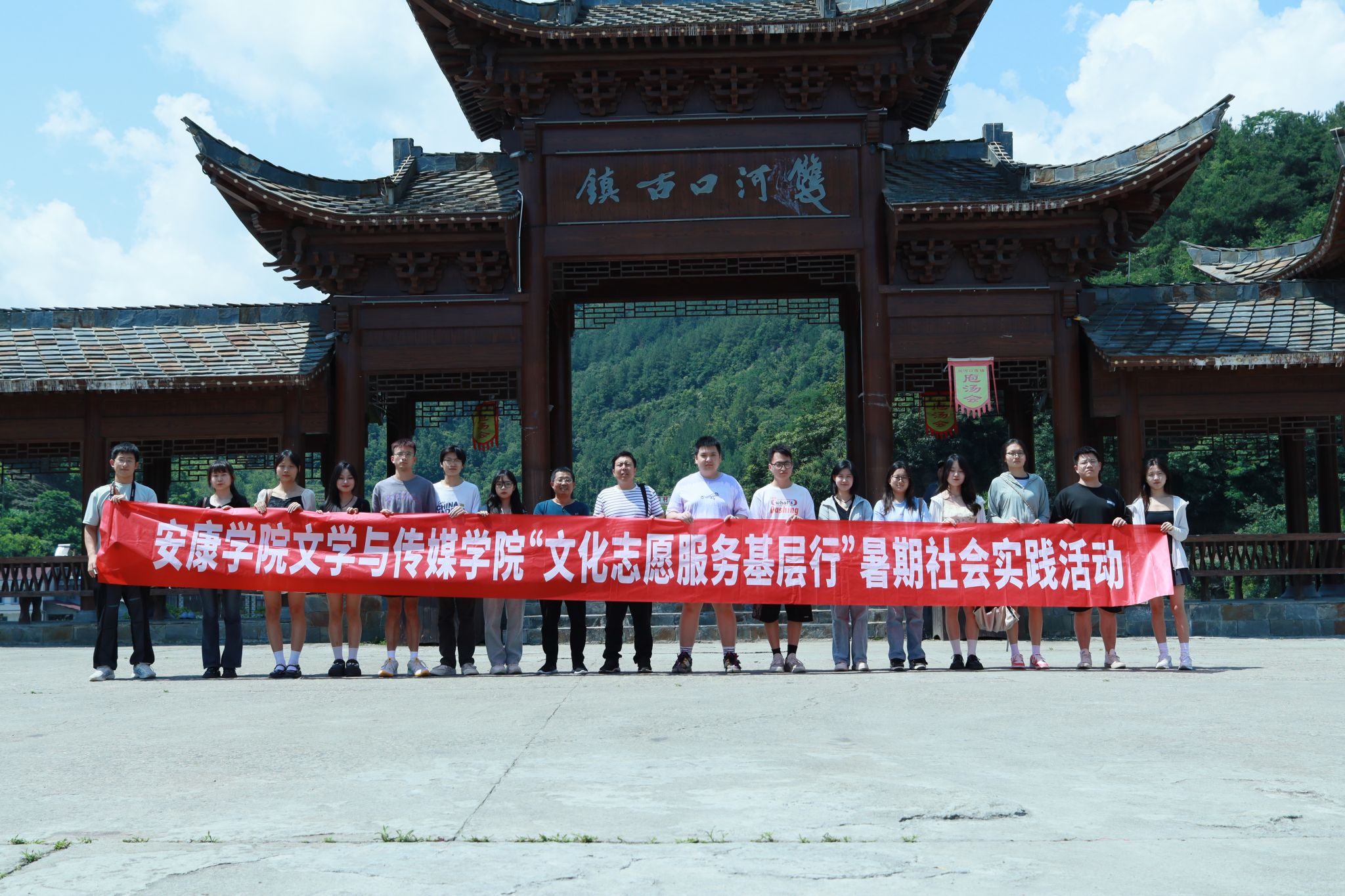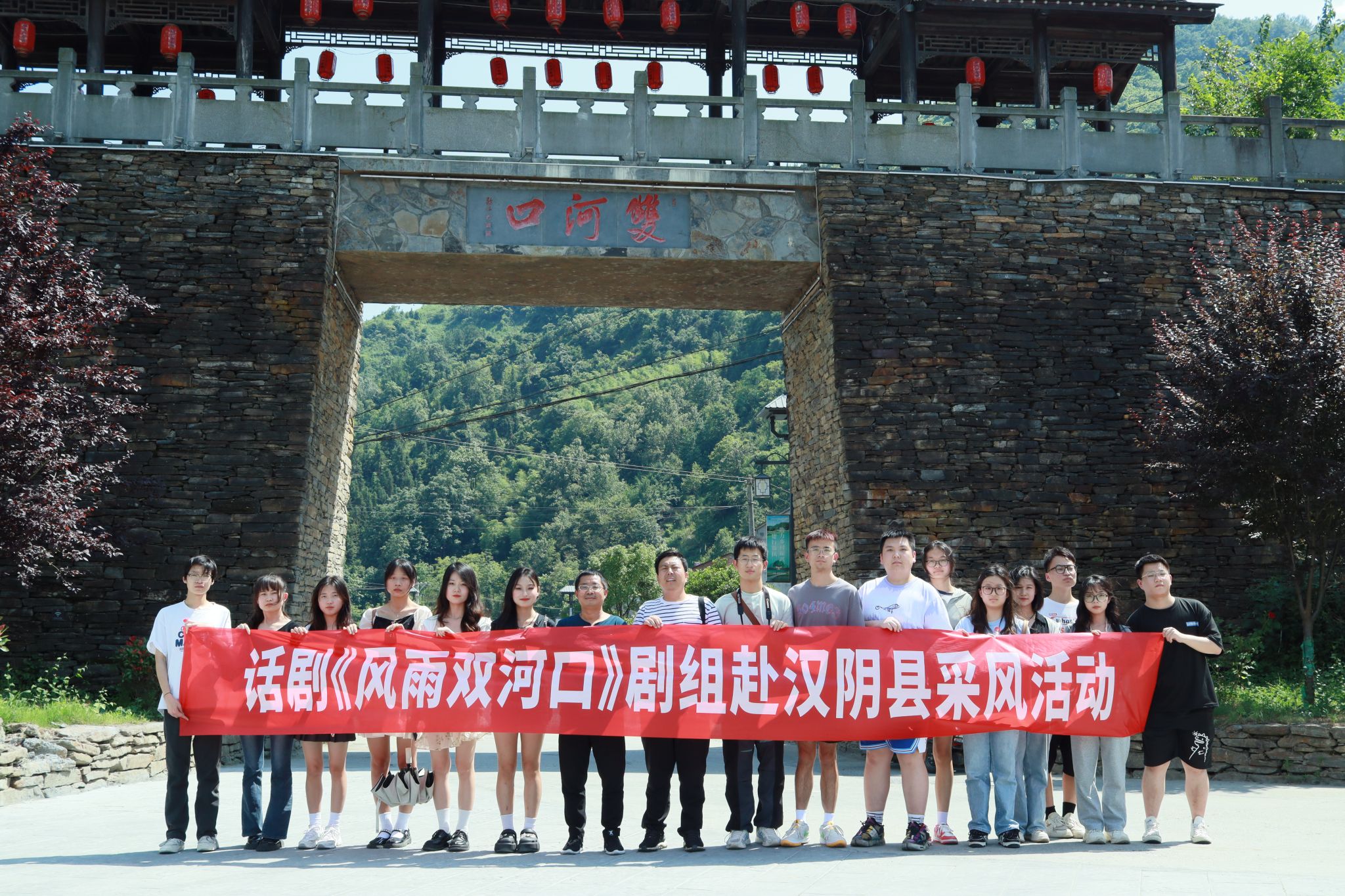 为深入学习贯彻习近平新时代中国特色社会主义思想,积极服务地方经济文化发展,1683168 3诸侯快讯入口组建了“文化志愿服务基层行”暑期三下乡社会实践服务队,并把活动的第一站选在了历史文化积淀深厚、红色文化影响很大的汉阴县北部山区双河口镇。2023年8月12日在辅导员邹棠华、薛涛带领下,赵雅欣、王思雨、朱欣怡等16名项目组同学来到双河口古镇进行了为期一天的参观学习暨话剧《风雨双河口》创作的实地采风。