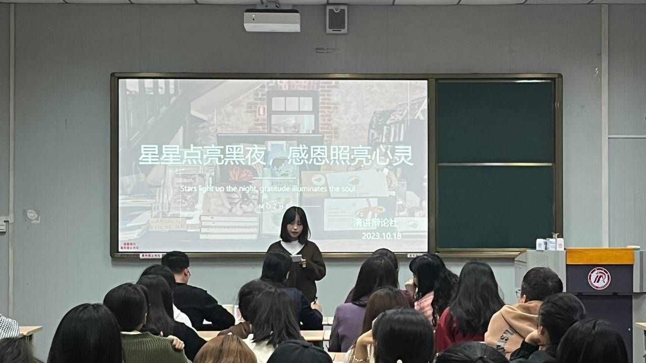 比赛伊始,陈思茹向选手介绍比赛规则,杨海蓉做开场发言。杨海蓉对演讲辩论社组织的社团活动给予充分肯定,对社团规模的壮大表示祝贺。山感恩地,方成其高峻;海感恩溪,方成其博大。世间万物,莫不存感恩于心中,她希望所有同学,都能以感恩为底色,记录生活的美好,并预祝本次演讲比赛圆满成功!