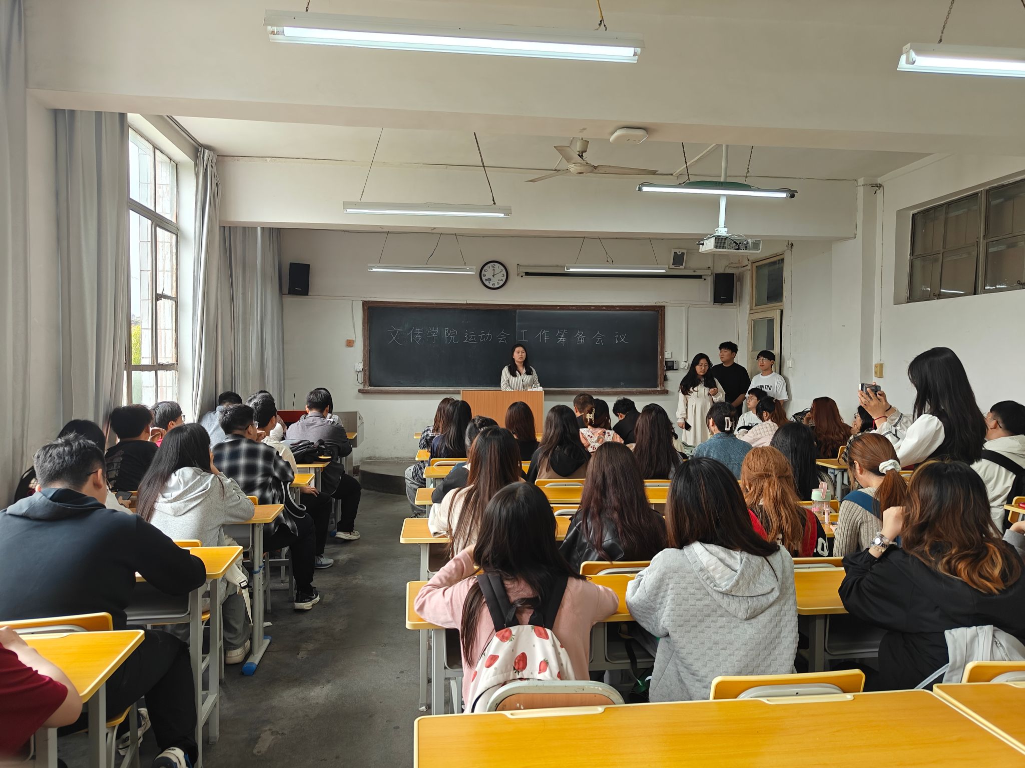 根据学院的整体部署,学工班主任薛涛就本届运动会做了具体的分工安排,并嘱咐学生会及各班班长明确各职能部门的职责分工,通力合作,助力运动员顺利完赛并取得好成绩。辅导员许明强调了运动会期间的纪律问题,希望学生干部要积极发挥带头作用,做好运动会期间服务工作,希望院学生分会各部门与各班齐心协力,提质增效,展现文传学子风采。