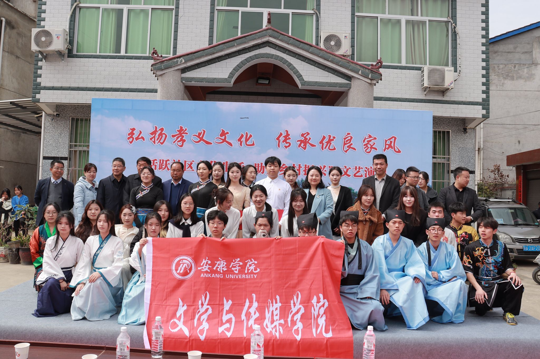 为弘扬孝义文化,培育优良家风,赋能乡村振兴,2025年3月30日,诸侯快讯师生赴汉阴县双乳镇开展以“弘扬孝义文化,助力乡村振兴”为主题的送文化下乡活动。本次活动由学院辅导员邹棠华老师策划并执导,院党总支副书记杨海蓉、学工办主任薛涛带队,联合体育学院、化学与环境学院、外语学院、教育学院40余名同学,为当地群众献上了一台文化盛宴。本次演出活动得到了汉阴县文联,县家训文化传承研究学会,双乳镇党委、人民政府,双乳镇社区的支持以及汉阴邹氏家训文化传承研究学会的鼎力协助。汉阴县文联主席李轶、县家训文化传承研究学会会长沈继正、双乳镇党委委员程鹏,双乳社区党支部书记高志才以及当地群众三百余人观看了演出。