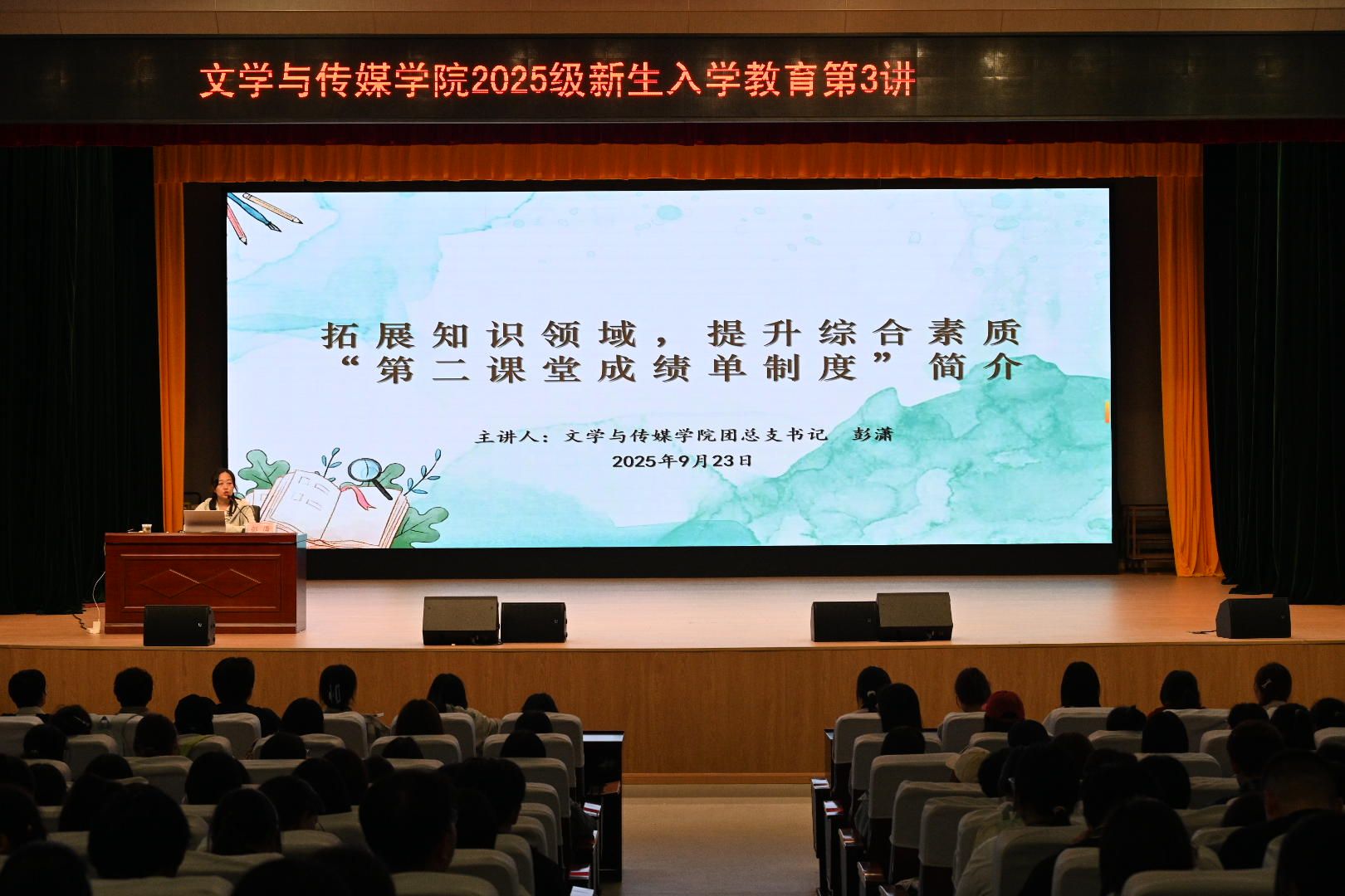 9月23日晚7点,1683168 3诸侯快讯入口在江南校区大礼堂开展新生入学教育第三讲。此次讲座聚焦“第二课堂成绩单制度”,由诸侯快讯团总支书记彭潇主讲,辅导员喻言主持,全体2025级新生参与。