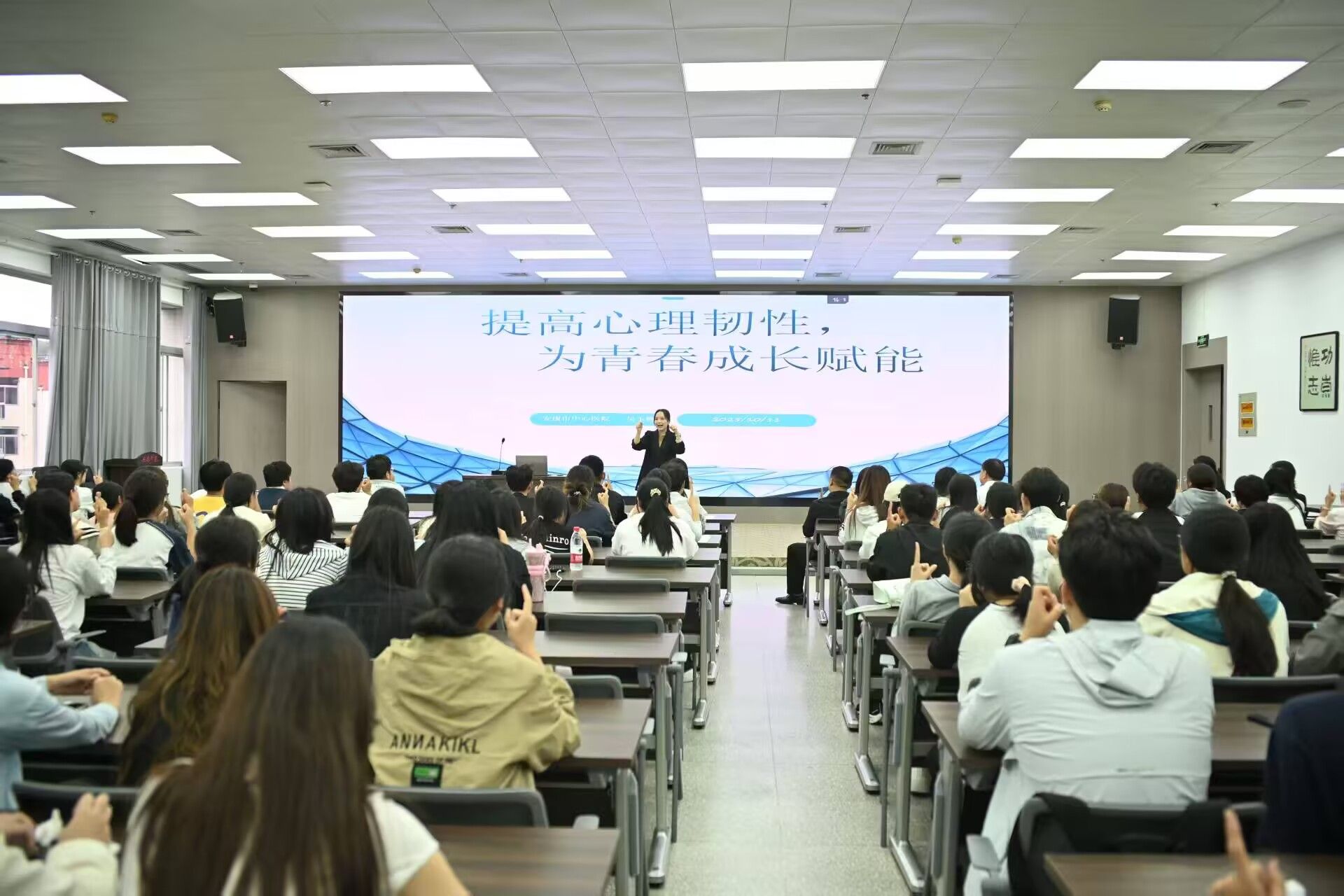 吴玉梅围绕“提高心理韧性,为青春成长赋能”主题,结合实用的压力管理策略、情绪调节技巧与人际沟通方法,将抽象心理知识转化为通俗表达,助力同学们提升心理韧性;同时鼓励同学们直面生活挑战,以积极乐观的心态拥抱青春。