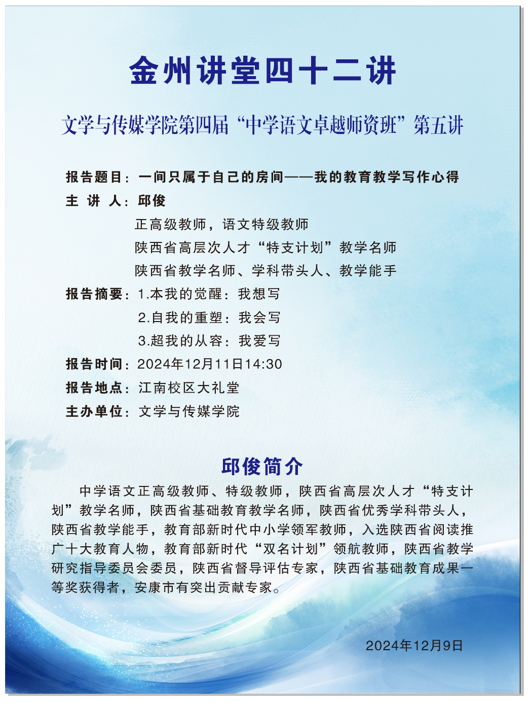 导航痕迹 首页 > 新闻通知 > 通知公告 > 正文 学院新闻 通知公告 金州讲堂四十二讲 主讲人:邱俊(陕西省高层次人才“特支计划”教学名师) 发布人:1683168 3诸侯快讯入口 发布日期:2024年12月09日 阅读次数: