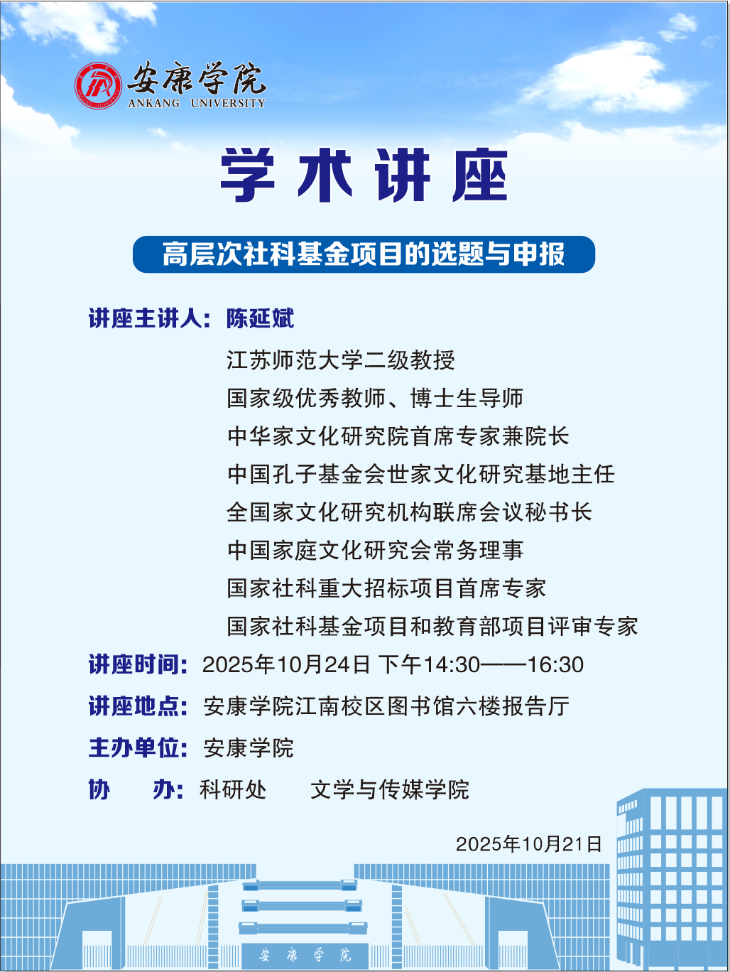 导航痕迹 首页 > 新闻通知 > 通知公告 > 正文 学院新闻 通知公告 学术讲座预告:高层次社科基金项目的选题与申报 发布人:1683168 3诸侯快讯入口 发布日期:2025年10月21日 阅读次数: